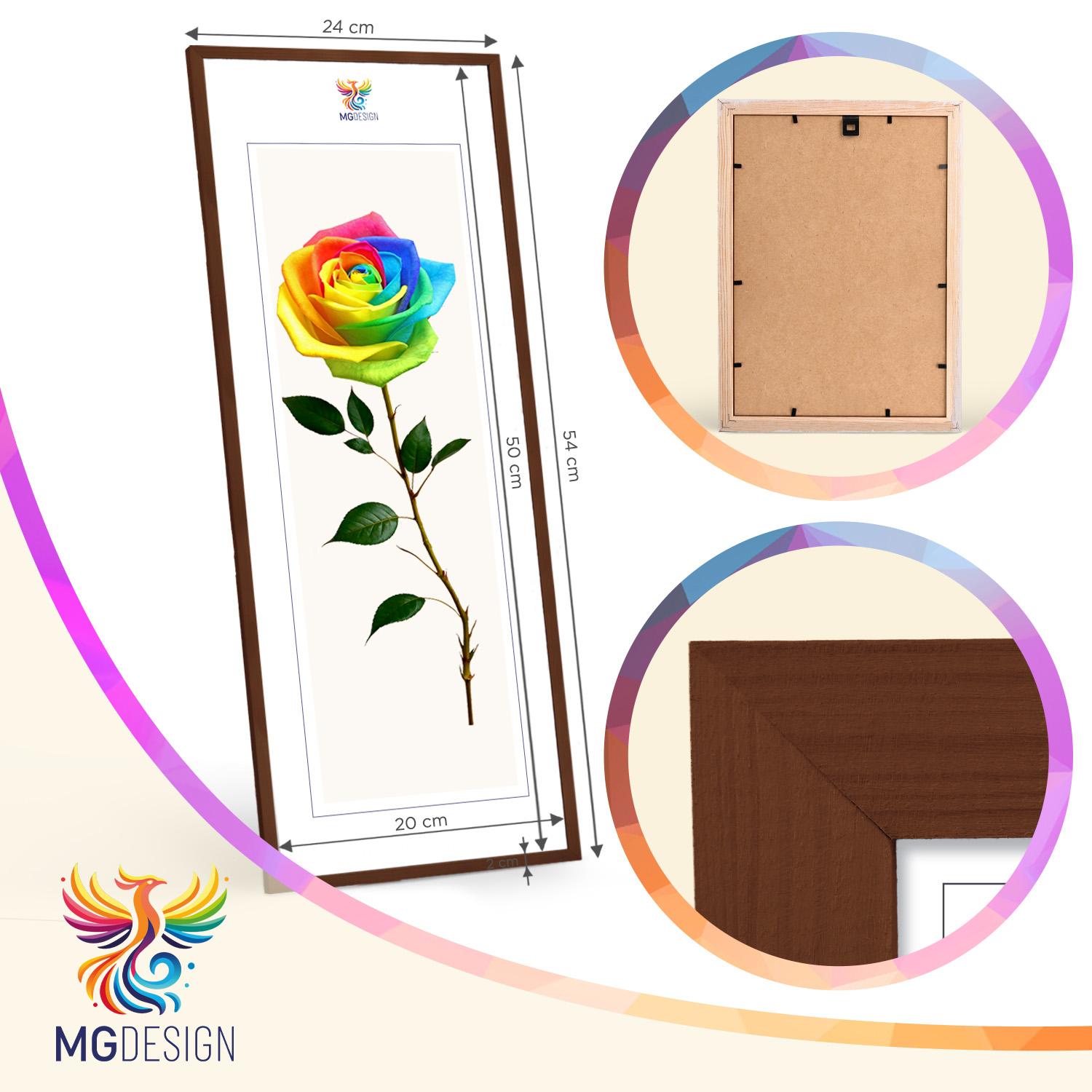 Zestaw drewnianych ramek to estetyczne i uniwersalne rozwiązanie do oprawy zdjęć, plakatów, grafik oraz wydruków dekoracyjnych. Klasyczny, profil ramek nadaje całej kompozycji elegancki wygląd i podkreśla prezentowane motywy, zachowując spójny i uporządkowany charakter aranżacji.