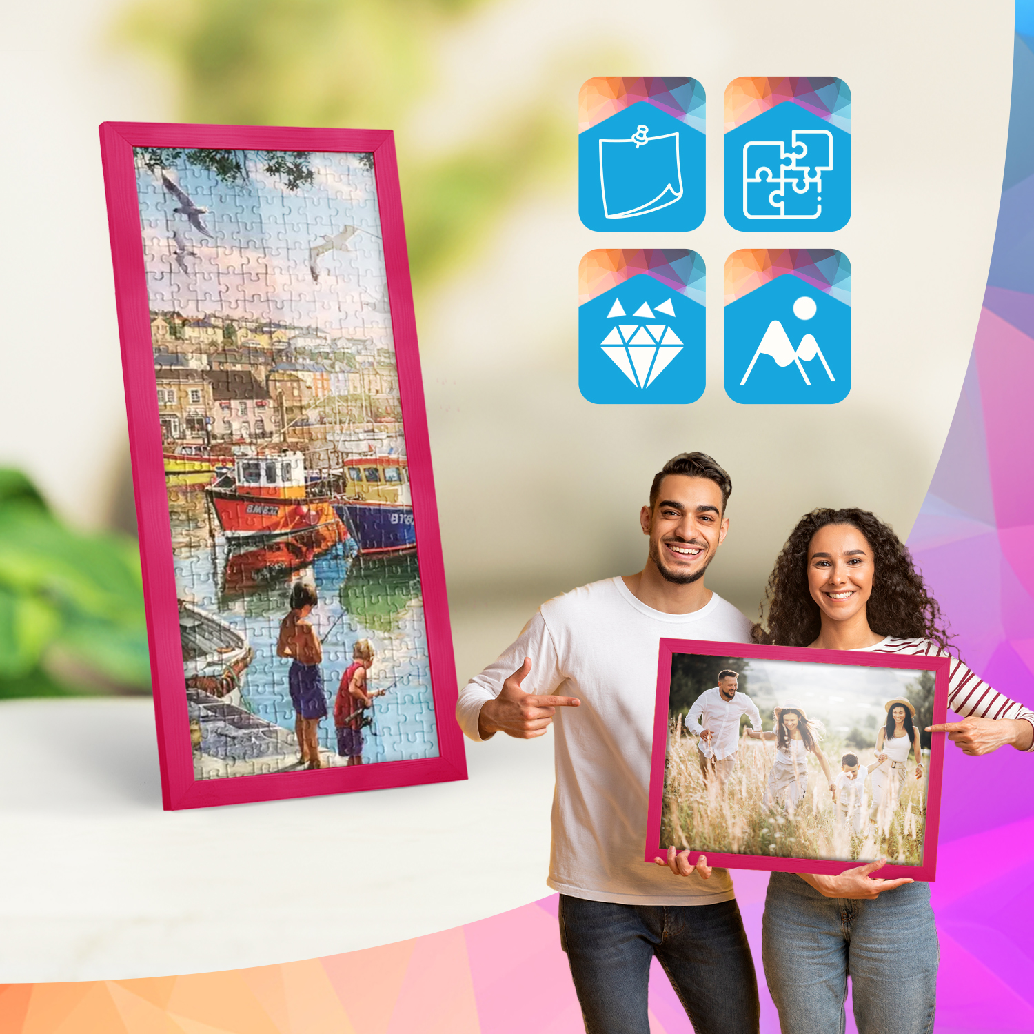 Ramki mogą być eksponowane zarówno na meblach, jak i na ścianie. Zintegrowane zawieszki pozwalają na ustawienie lub zawieszenie ramek w pionie lub w poziomie, dzięki czemu łatwo dopasować zestaw do aranżacji wnętrza.