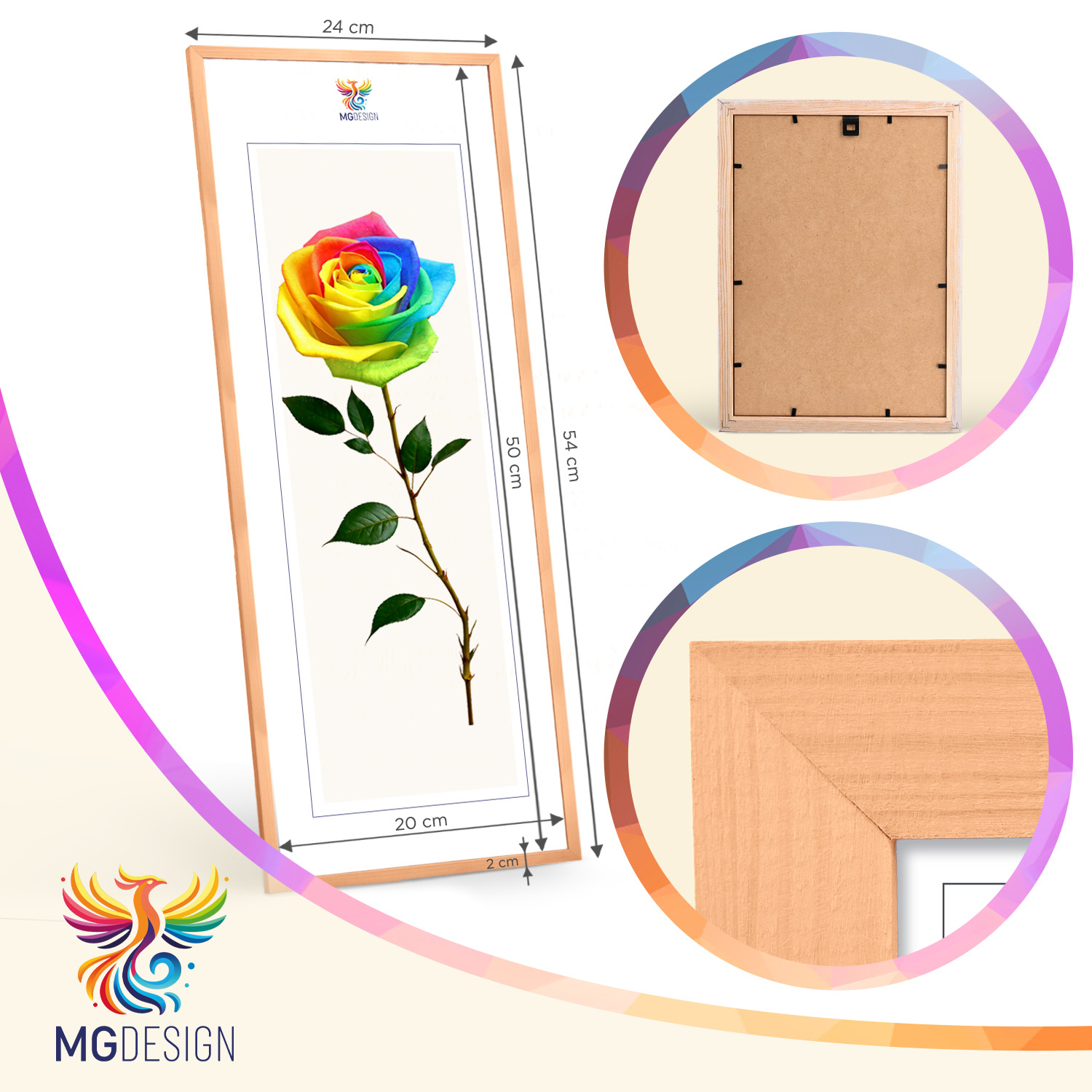 Ramki wykonane są z naturalnego drewna, starannie obrobionego, z zachowaniem widocznej struktury materiału, która nadaje całości naturalny i ponadczasowy charakter. Przód ramek stanowi lekkie i odporne na uszkodzenia plexi, które jest bezpieczniejszą alternatywą dla tradycyjnego szkła i zapewnia dobrą widoczność oprawianych prac.