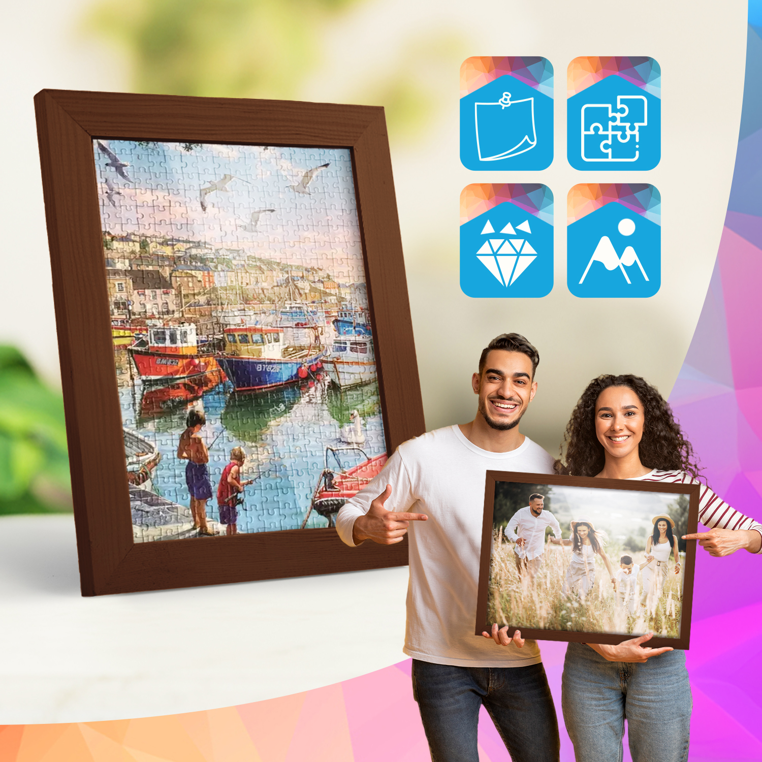 Zestaw drewnianych ramek to estetyczne i uniwersalne rozwiązanie do oprawy zdjęć, plakatów, grafik oraz wydruków dekoracyjnych. Klasyczny, profil ramek nadaje całej kompozycji elegancki wygląd i podkreśla prezentowane motywy, zachowując spójny i uporządkowany charakter aranżacji.