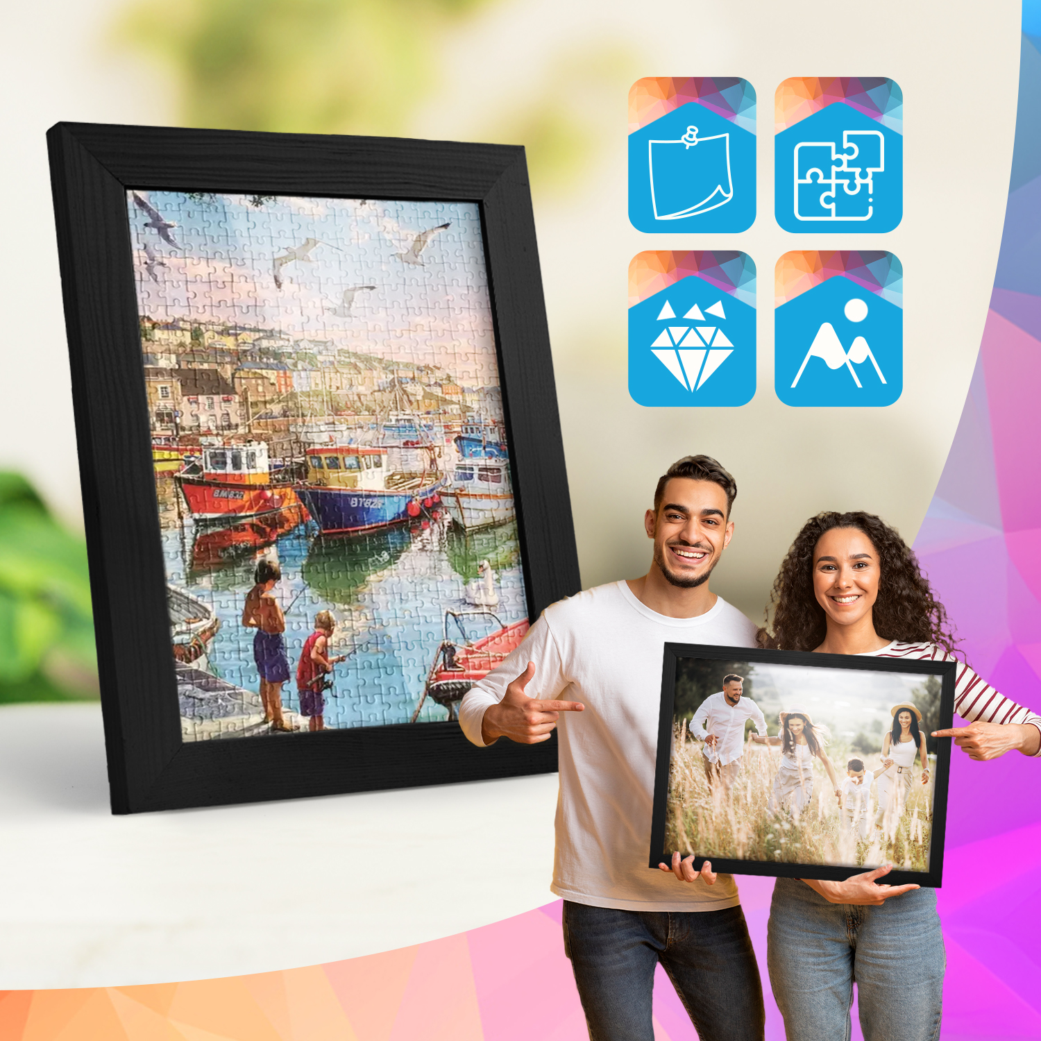 Ramki mogą być eksponowane zarówno na meblach, jak i na ścianie. Zintegrowane zawieszki pozwalają na ustawienie lub zawieszenie ramek w pionie lub w poziomie, dzięki czemu łatwo dopasować zestaw do aranżacji wnętrza.