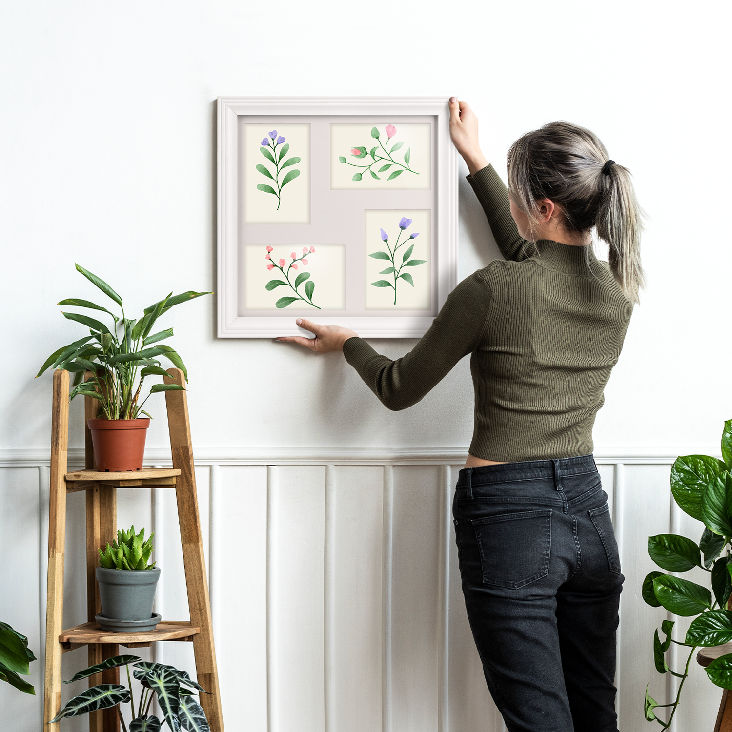 Ramki galerii mogą być ustawione na meblach lub zawieszone na ścianie. Dzięki frezowanemu profilowi całość prezentuje się schludnie i pasuje zarówno do wnętrz domowych, jak i biur czy przestrzeni komercyjnych.