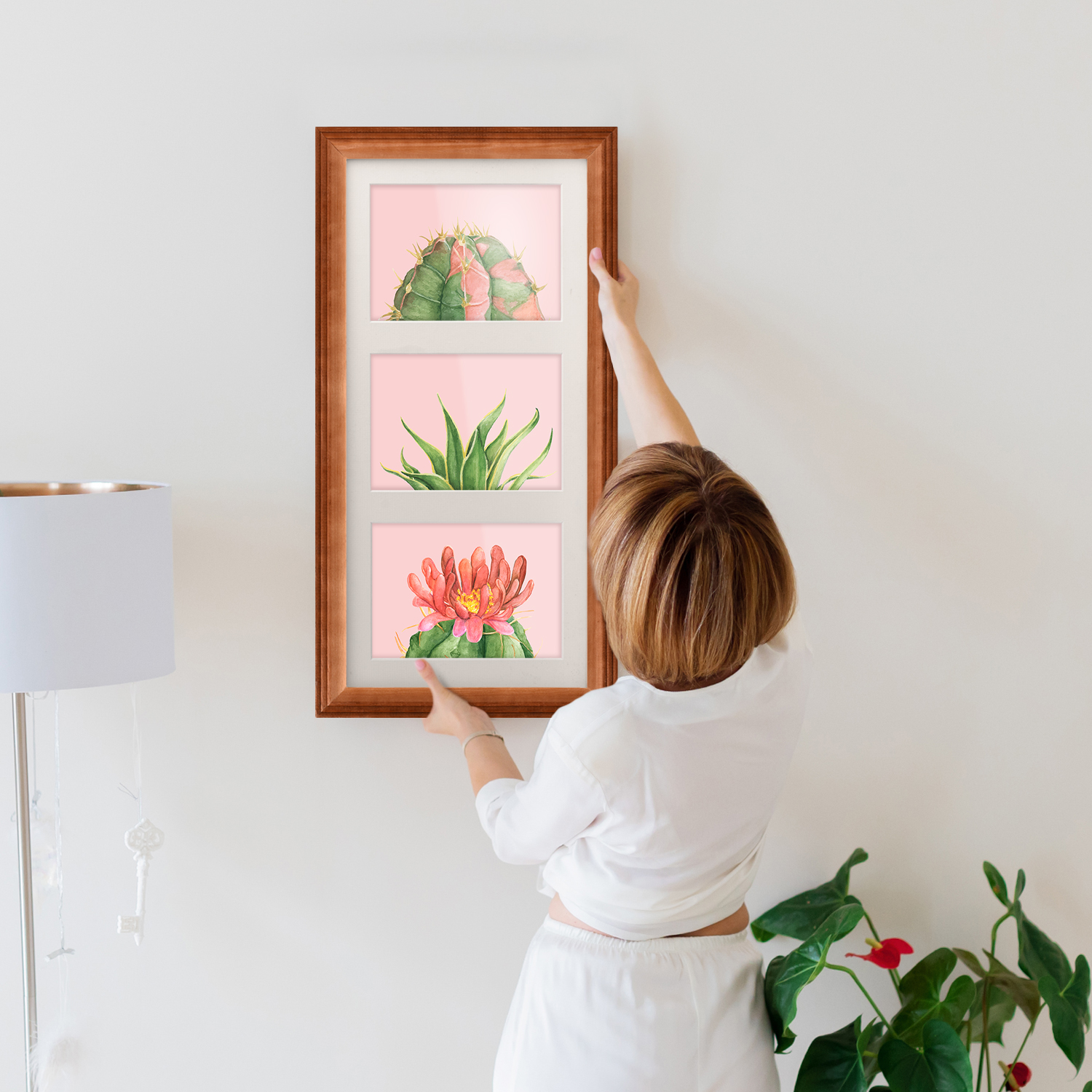 Zestaw drewnianych ramek galerii (multiramek) to estetyczne i praktyczne rozwiązanie do prezentacji kilku zdjęć, grafik lub pamiątek w spójnej oprawie. Wysoki profil ramek nadaje kompozycji przestrzenność i sprawia, że całość wyraźnie odcina się od ściany, podkreślając prezentowane motywy.