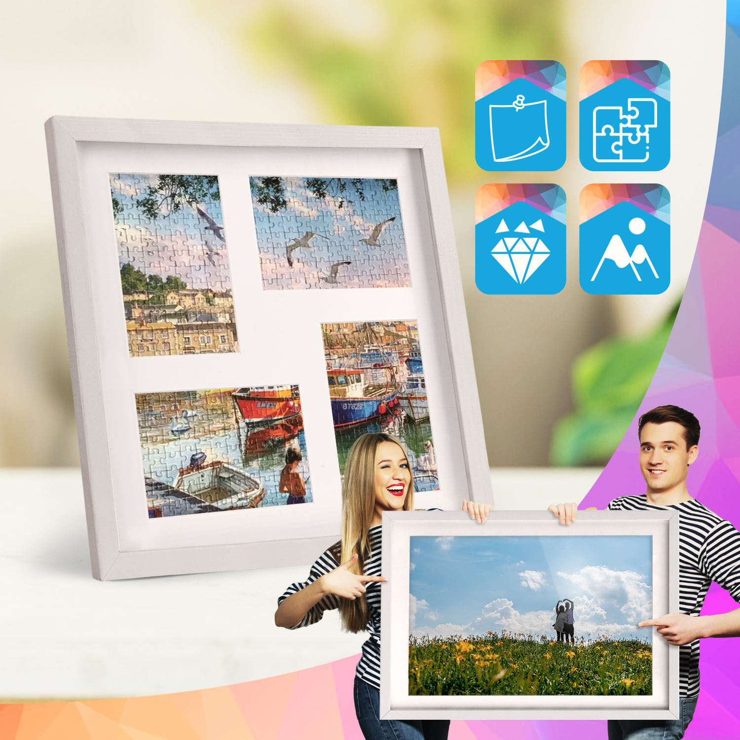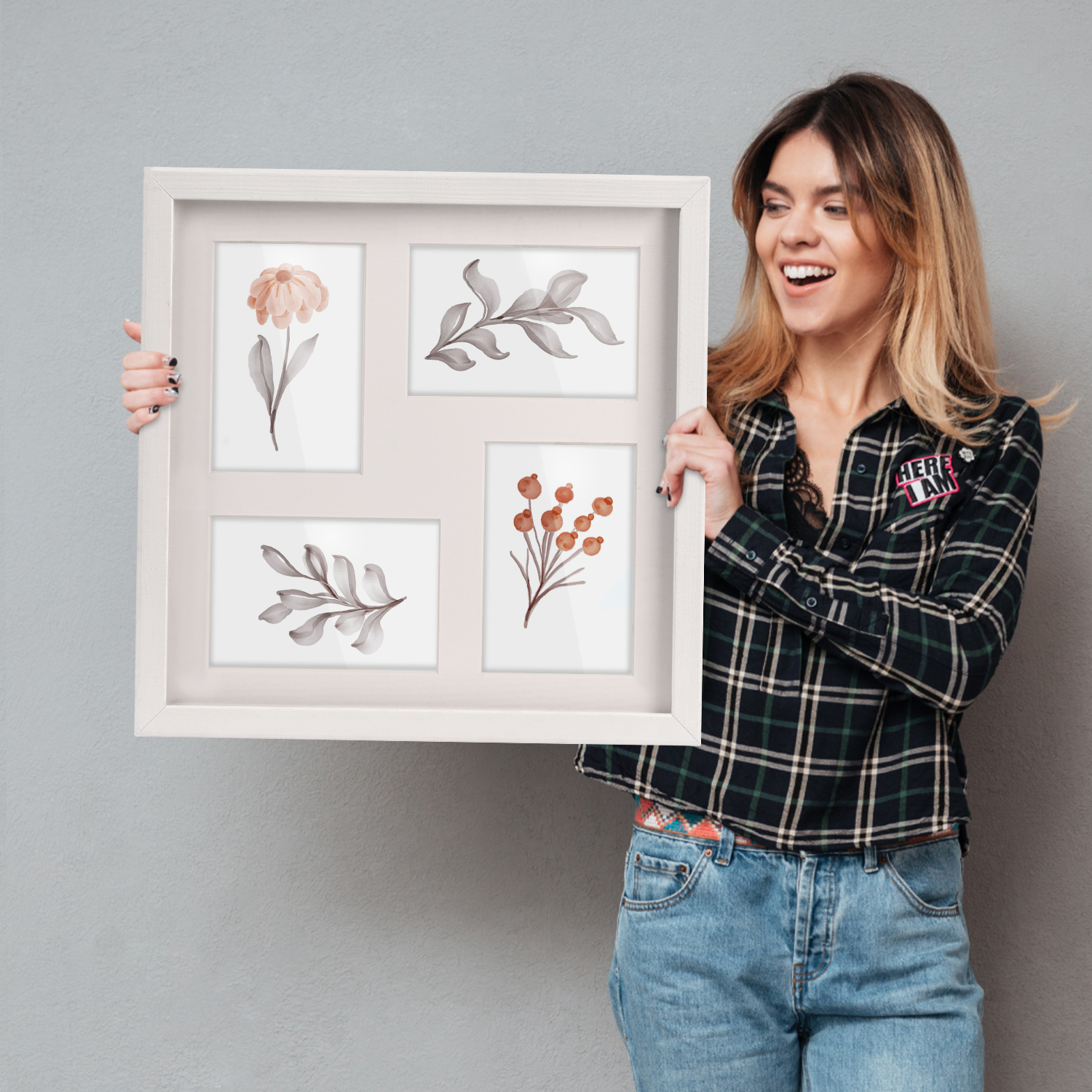 W zestawie znajduje się passe-partout do każdej ramki, z precyzyjnie wyciętymi otworami, które oddzielają poszczególne fotografie i tworzą estetyczny odstęp pomiędzy zdjęciami a plexi. Takie rozwiązanie wzmacnia efekt wizualny i nadaje całej galerii spójny, profesjonalny wygląd. Stabilna płyta HDF oraz solidne metalowe zawieszki umożliwiają szybki montaż oraz łatwą wymianę zdjęć bez użycia narzędzi.