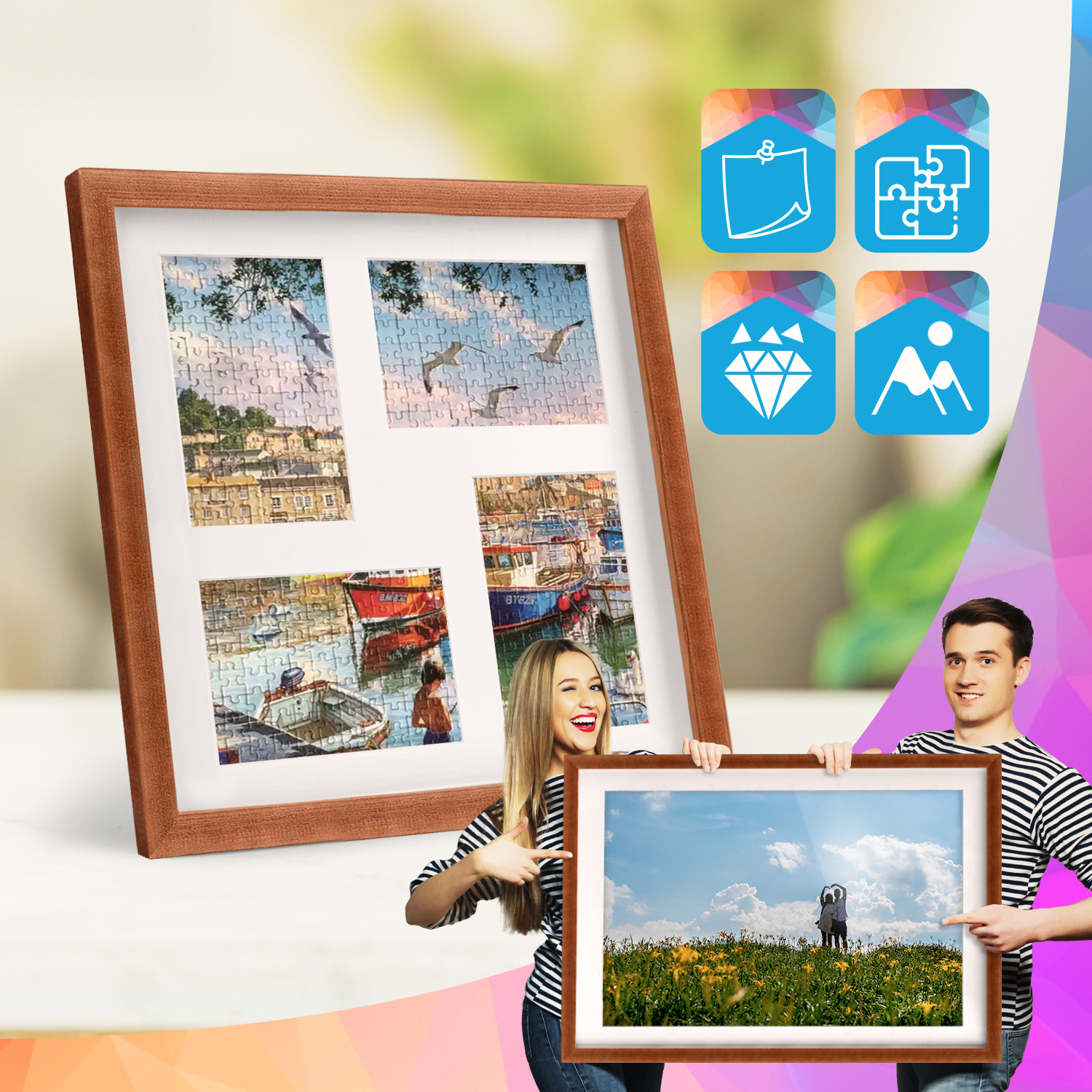 W zestawie znajduje się passe-partout do każdej ramki, z precyzyjnie wyciętymi otworami, które oddzielają poszczególne fotografie i tworzą estetyczny odstęp pomiędzy zdjęciami a plexi. Takie rozwiązanie wzmacnia efekt wizualny i nadaje całej galerii spójny, profesjonalny wygląd. Stabilna płyta HDF oraz solidne metalowe zawieszki umożliwiają szybki montaż oraz łatwą wymianę zdjęć bez użycia narzędzi.