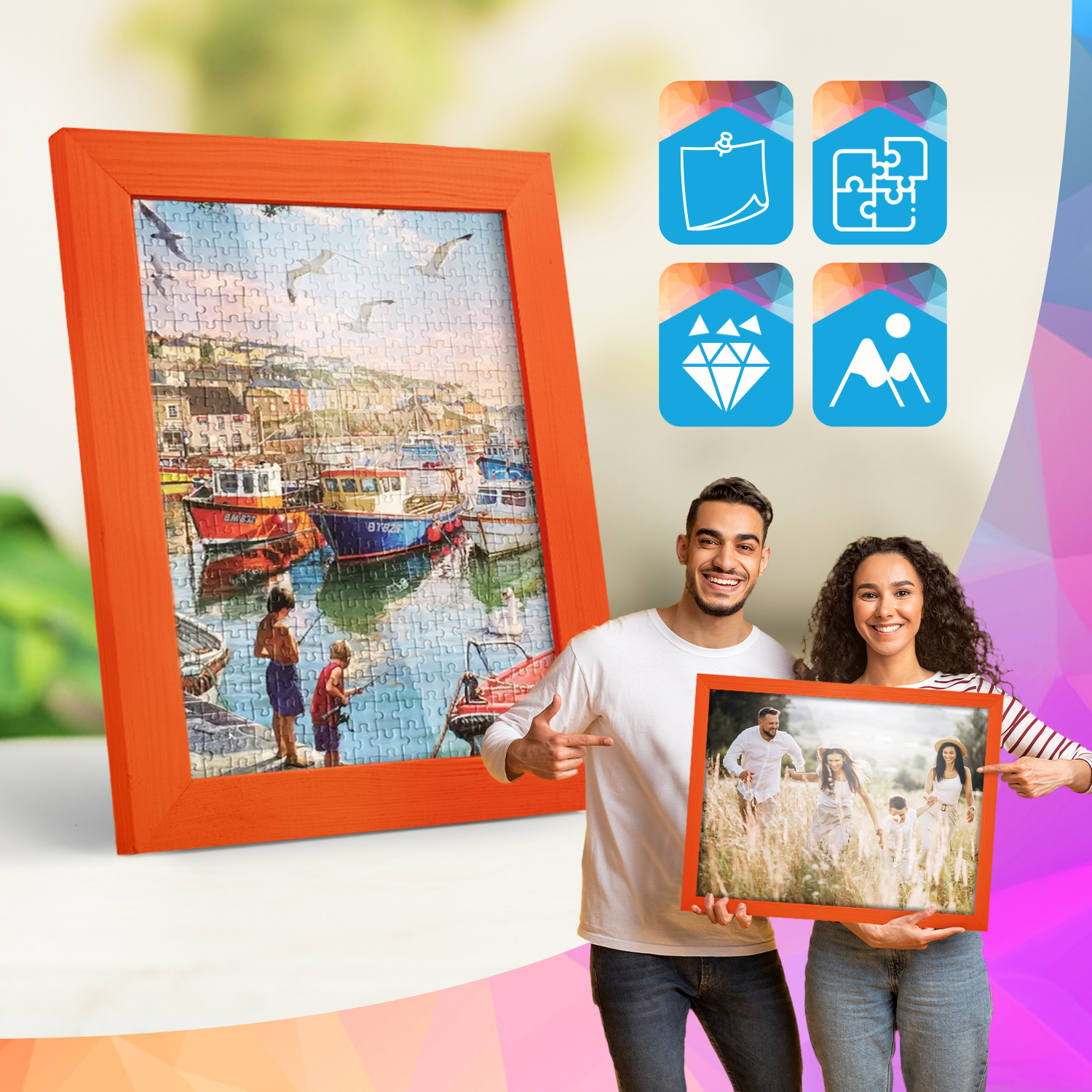 Ramki mogą być eksponowane zarówno na meblach, jak i na ścianie. Zintegrowane zawieszki pozwalają na ustawienie lub zawieszenie ramek w pionie lub w poziomie, dzięki czemu łatwo dopasować zestaw do aranżacji wnętrza.
