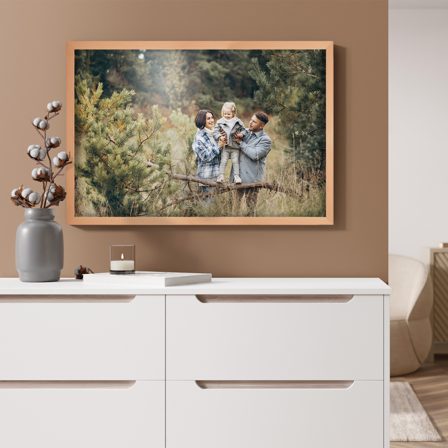 Ramki wykonane są z naturalnego drewna, starannie obrobionego, z zachowaniem widocznej struktury materiału, która nadaje całości naturalny i ponadczasowy charakter. Przód ramek stanowi lekkie i odporne na uszkodzenia plexi, które jest bezpieczniejszą alternatywą dla tradycyjnego szkła i zapewnia dobrą widoczność oprawianych prac.