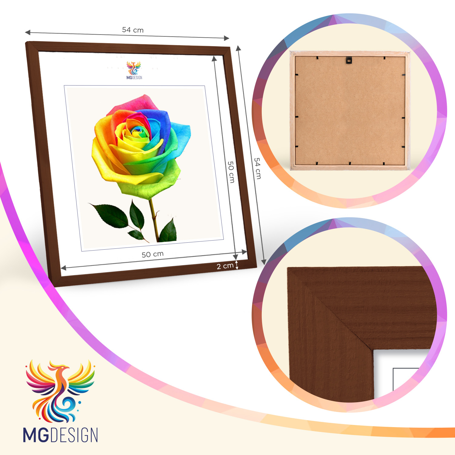 Ramki wykonane są z naturalnego drewna, starannie obrobionego, z zachowaniem widocznej struktury materiału, która nadaje całości naturalny i ponadczasowy charakter. Przód ramek stanowi lekkie i odporne na uszkodzenia plexi, które jest bezpieczniejszą alternatywą dla tradycyjnego szkła i zapewnia dobrą widoczność oprawianych prac.