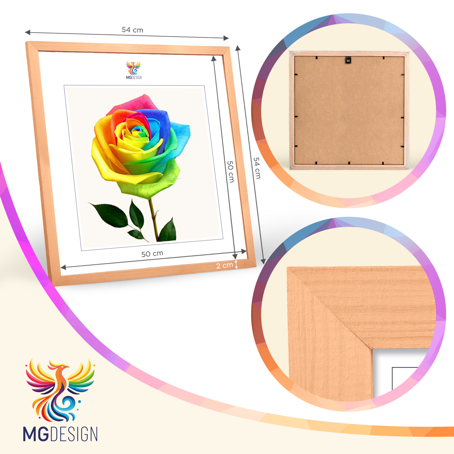 Ramki wykonane są z naturalnego drewna, starannie obrobionego, z zachowaniem widocznej struktury materiału, która nadaje całości naturalny i ponadczasowy charakter. Przód ramek stanowi lekkie i odporne na uszkodzenia plexi, które jest bezpieczniejszą alternatywą dla tradycyjnego szkła i zapewnia dobrą widoczność oprawianych prac.