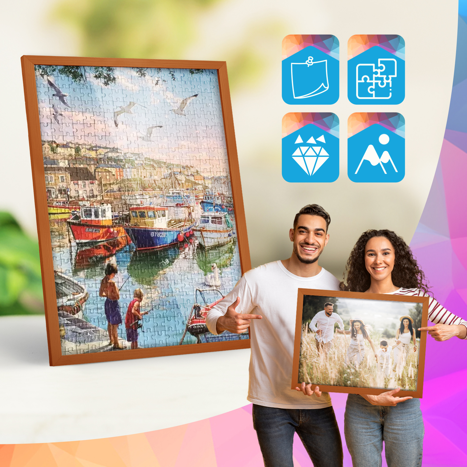 Zestaw drewnianych ramek to estetyczne i uniwersalne rozwiązanie do oprawy zdjęć, plakatów, grafik oraz wydruków dekoracyjnych. Klasyczny, profil ramek nadaje całej kompozycji elegancki wygląd i podkreśla prezentowane motywy, zachowując spójny i uporządkowany charakter aranżacji.