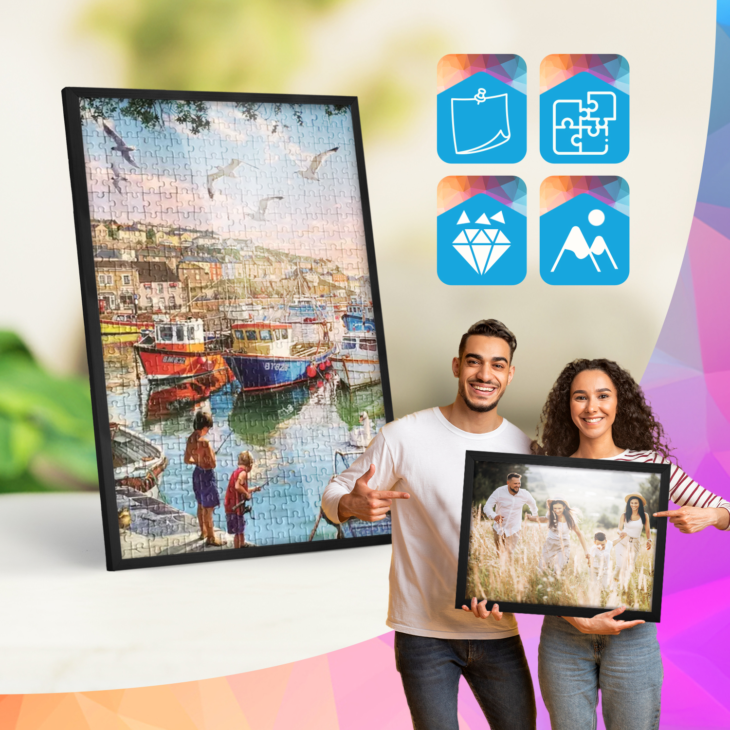 Ramki mogą być eksponowane zarówno na meblach, jak i na ścianie. Zintegrowane zawieszki pozwalają na ustawienie lub zawieszenie ramek w pionie lub w poziomie, dzięki czemu łatwo dopasować zestaw do aranżacji wnętrza.