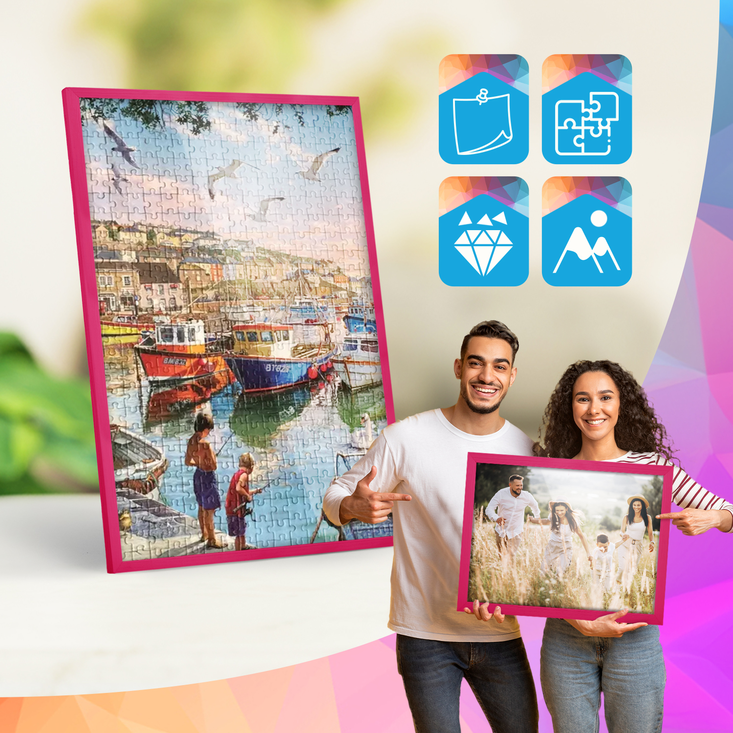 Ramki mogą być eksponowane zarówno na meblach, jak i na ścianie. Zintegrowane zawieszki pozwalają na ustawienie lub zawieszenie ramek w pionie lub w poziomie, dzięki czemu łatwo dopasować zestaw do aranżacji wnętrza.