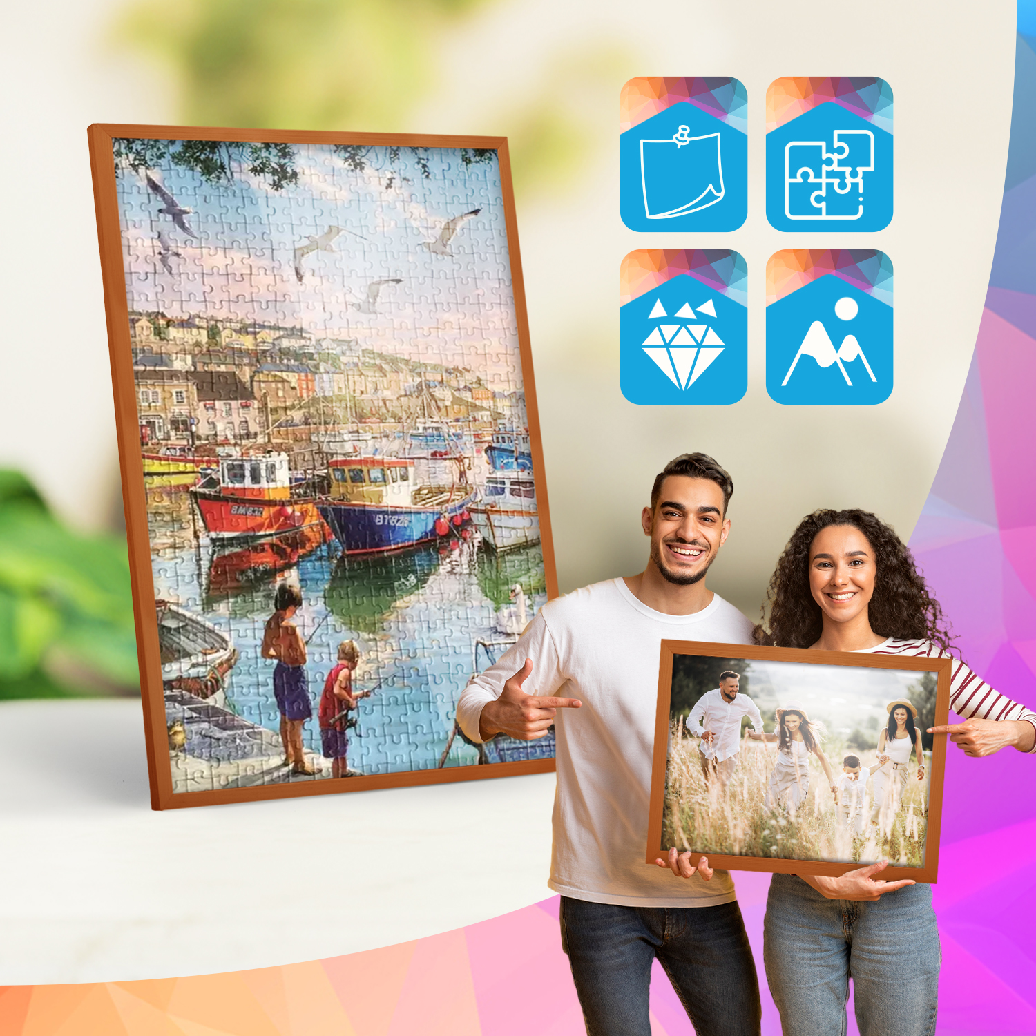 Zestaw drewnianych ramek to estetyczne i uniwersalne rozwiązanie do oprawy zdjęć, plakatów, grafik oraz wydruków dekoracyjnych. Klasyczny, profil ramek nadaje całej kompozycji elegancki wygląd i podkreśla prezentowane motywy, zachowując spójny i uporządkowany charakter aranżacji.