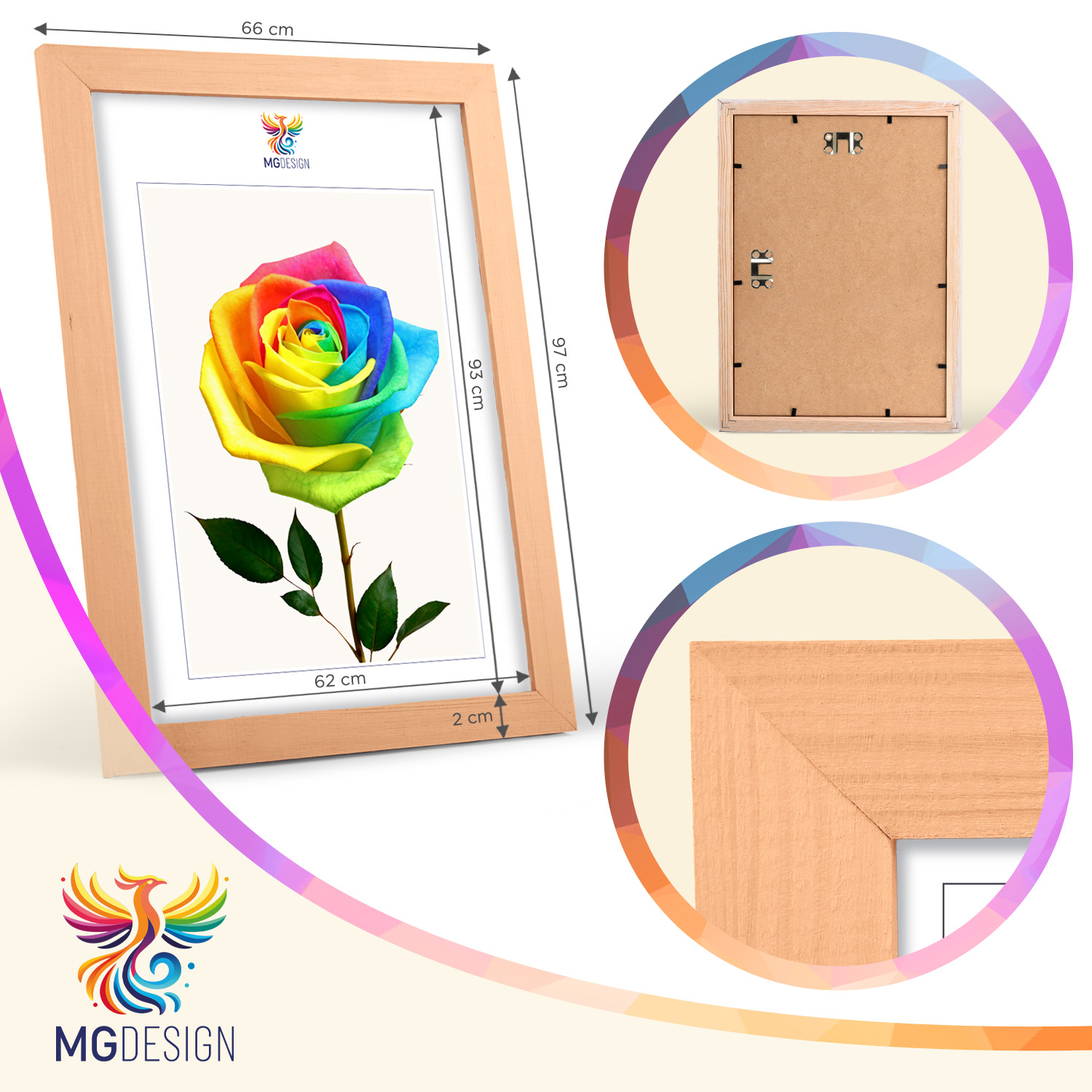 Ramki wykonane są z naturalnego drewna, starannie obrobionego, z zachowaniem widocznej struktury materiału, która nadaje całości naturalny i ponadczasowy charakter. Przód ramek stanowi lekkie i odporne na uszkodzenia plexi, które jest bezpieczniejszą alternatywą dla tradycyjnego szkła i zapewnia dobrą widoczność oprawianych prac.