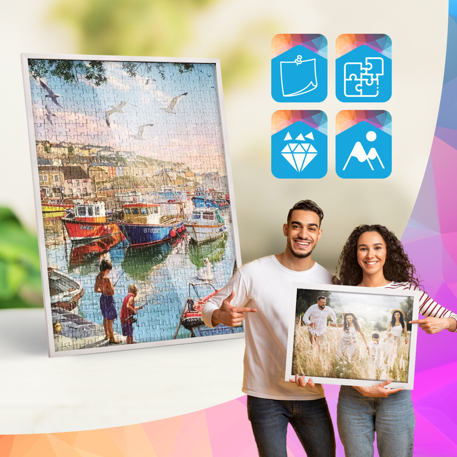 Ramki mogą być eksponowane zarówno na meblach, jak i na ścianie. Zintegrowane zawieszki pozwalają na ustawienie lub zawieszenie ramek w pionie lub w poziomie, dzięki czemu łatwo dopasować zestaw do aranżacji wnętrza.