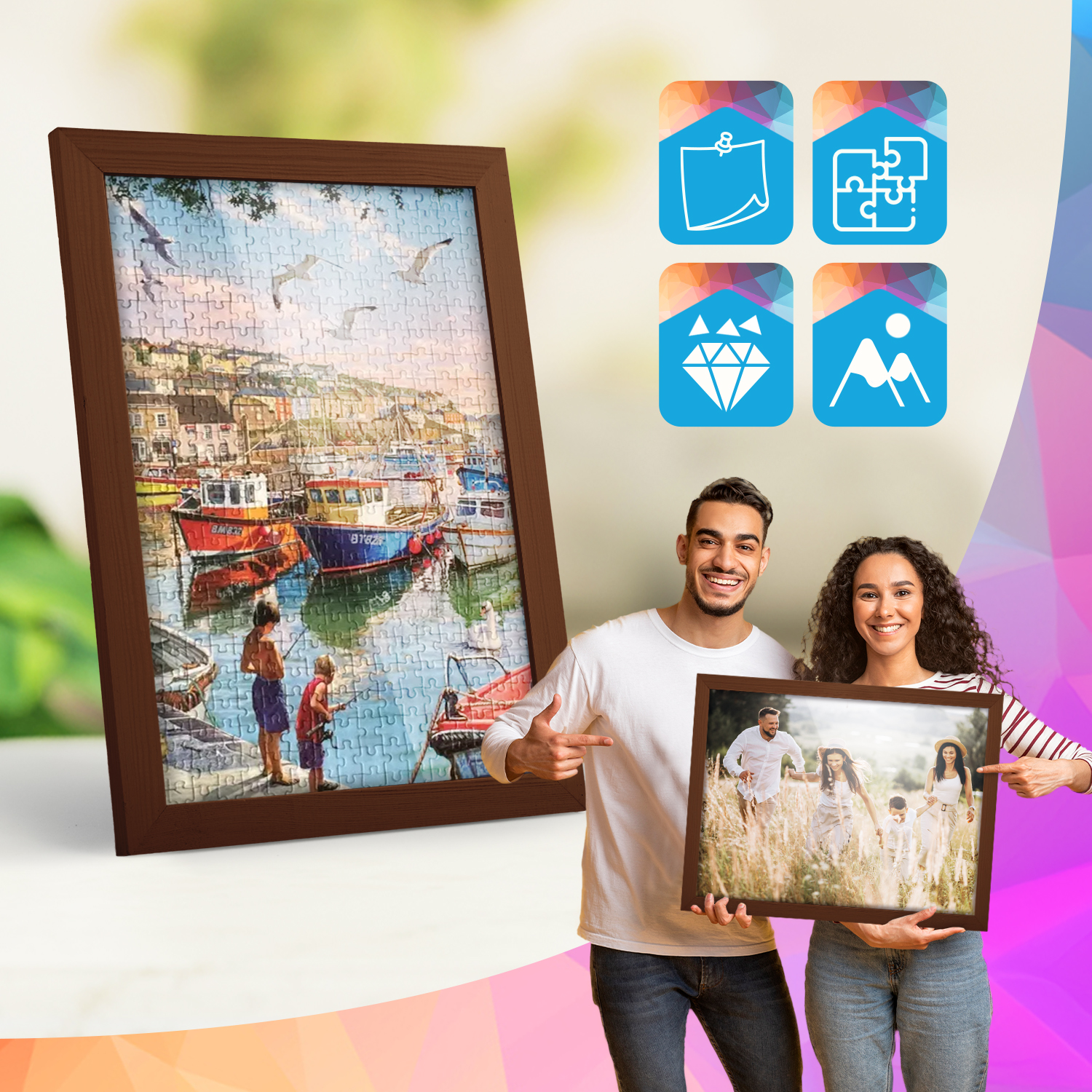 Zestaw drewnianych ramek to estetyczne i uniwersalne rozwiązanie do oprawy zdjęć, plakatów, grafik oraz wydruków dekoracyjnych. Klasyczny, profil ramek nadaje całej kompozycji elegancki wygląd i podkreśla prezentowane motywy, zachowując spójny i uporządkowany charakter aranżacji.