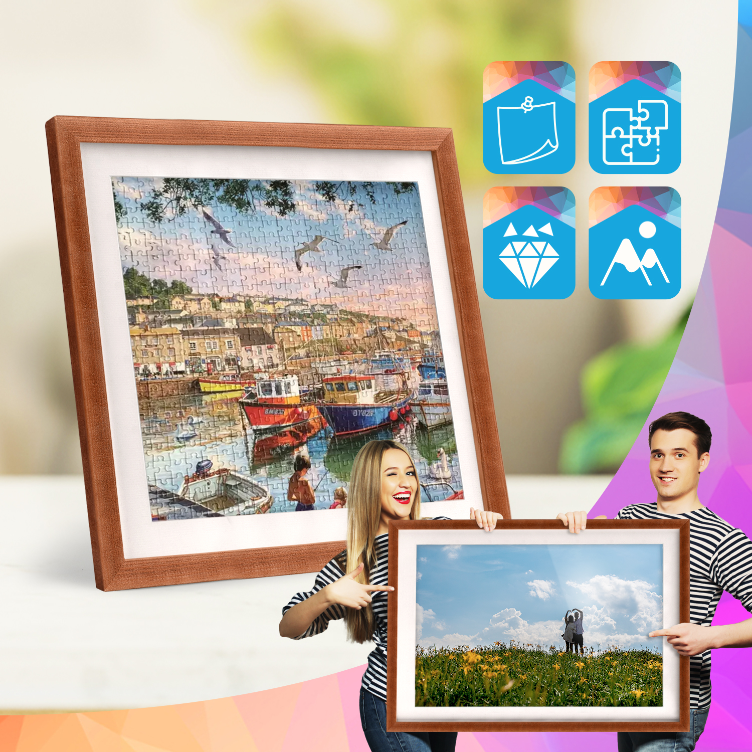 Ramki wykonane są z naturalnego drewna, starannie obrobionego, z zachowaniem widocznej struktury materiału, która nadaje całości naturalny i ponadczasowy charakter. Przód ramek stanowi lekkie i odporne na uszkodzenia plexi, które zapewnia dobrą widoczność oprawianych prac oraz większe bezpieczeństwo w porównaniu do tradycyjnego szkła.