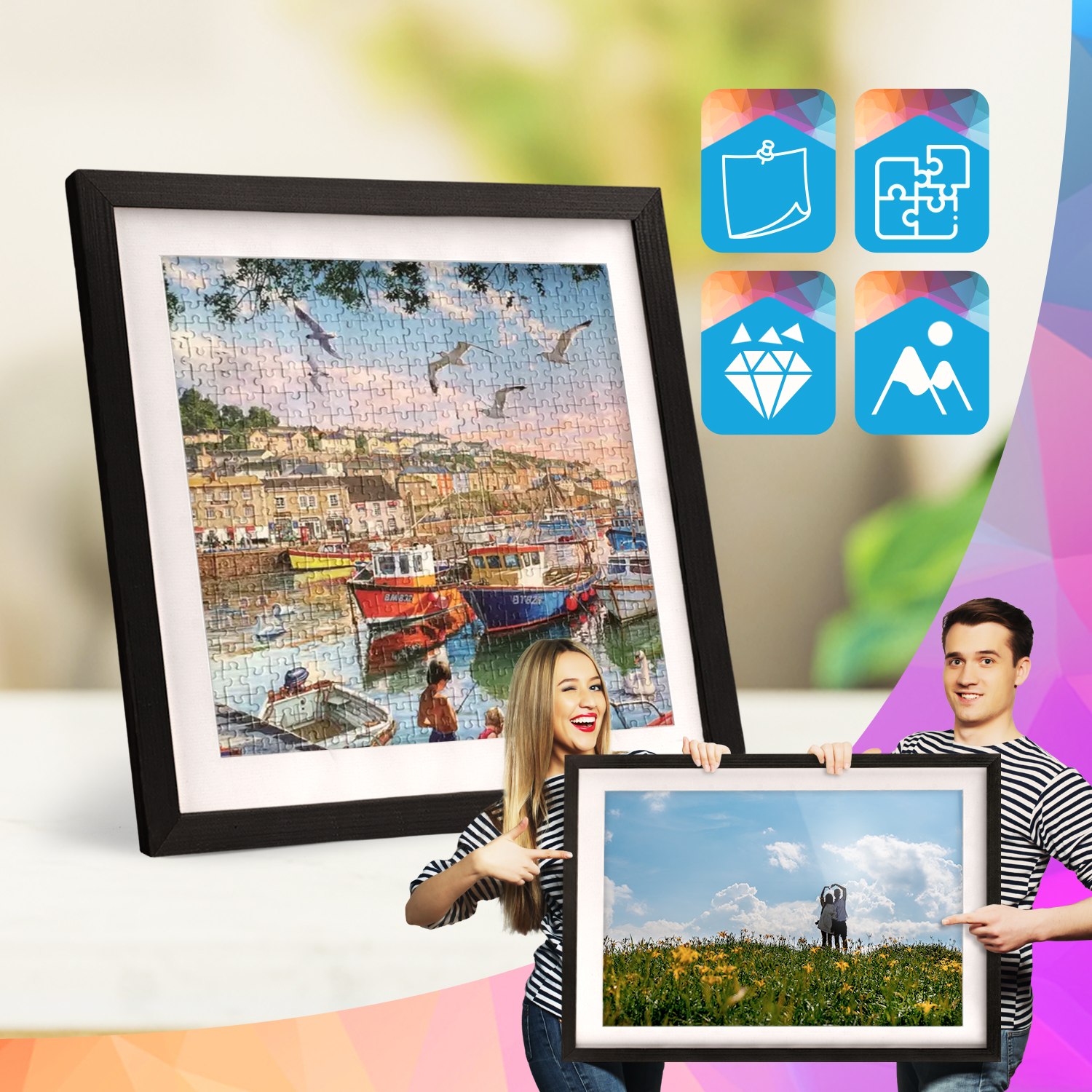 Ramki mogą być ustawione na meblach lub zawieszone na ścianie. Dzięki wysokiemu profilowi uzyskują nowoczesny efekt odsunięcia obrazów od powierzchni, który dobrze prezentuje się zarówno w domowych, jak i komercyjnych wnętrzach.