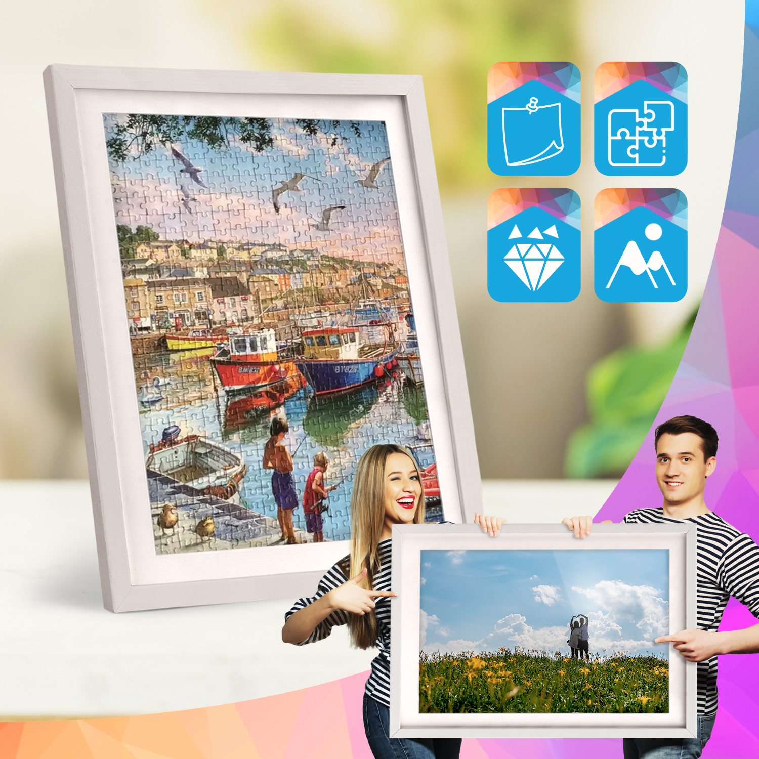 Ramki mogą być ustawione na meblach lub zawieszone na ścianie. Dzięki wysokiemu profilowi uzyskują nowoczesny efekt odsunięcia obrazów od powierzchni, który dobrze prezentuje się zarówno w domowych, jak i komercyjnych wnętrzach.
