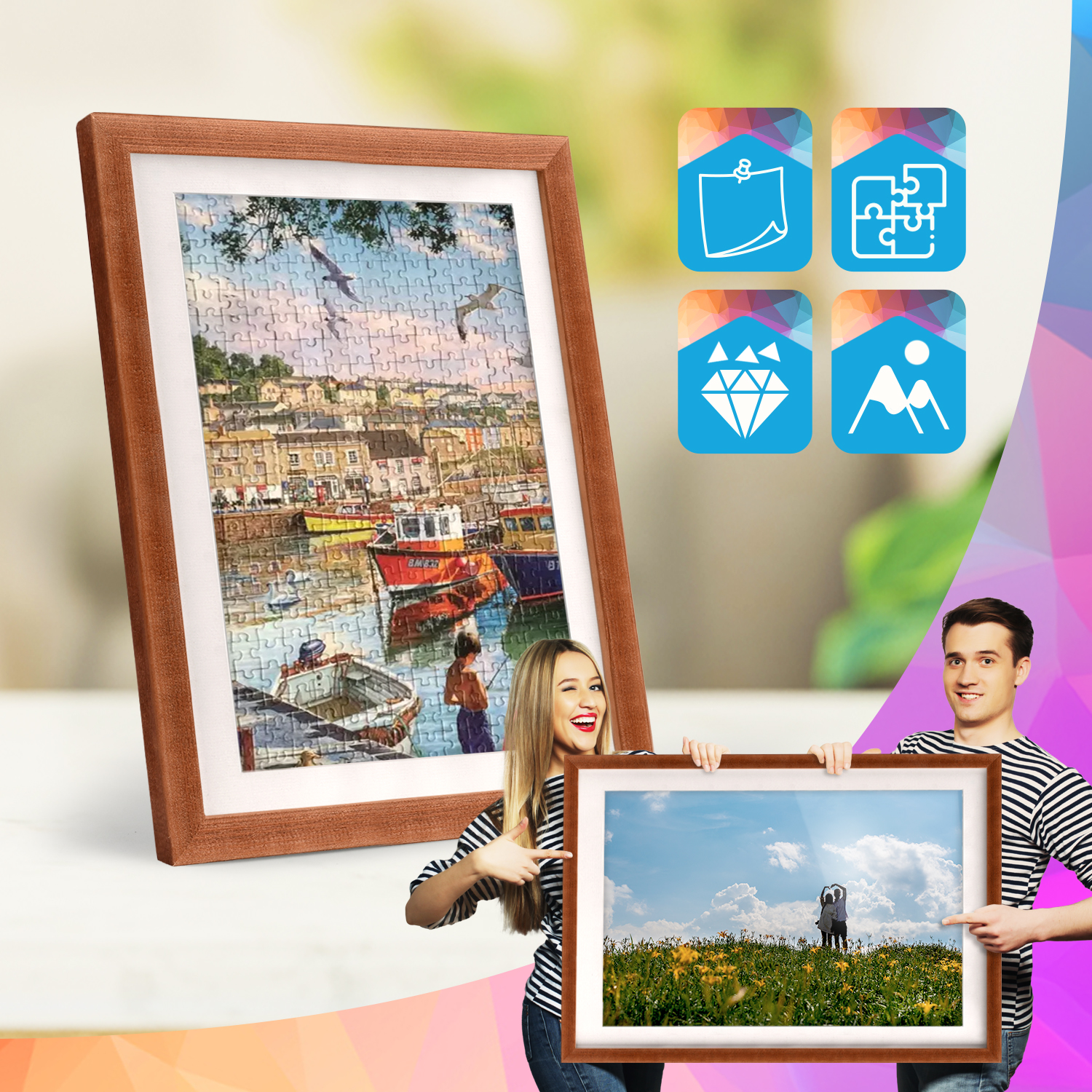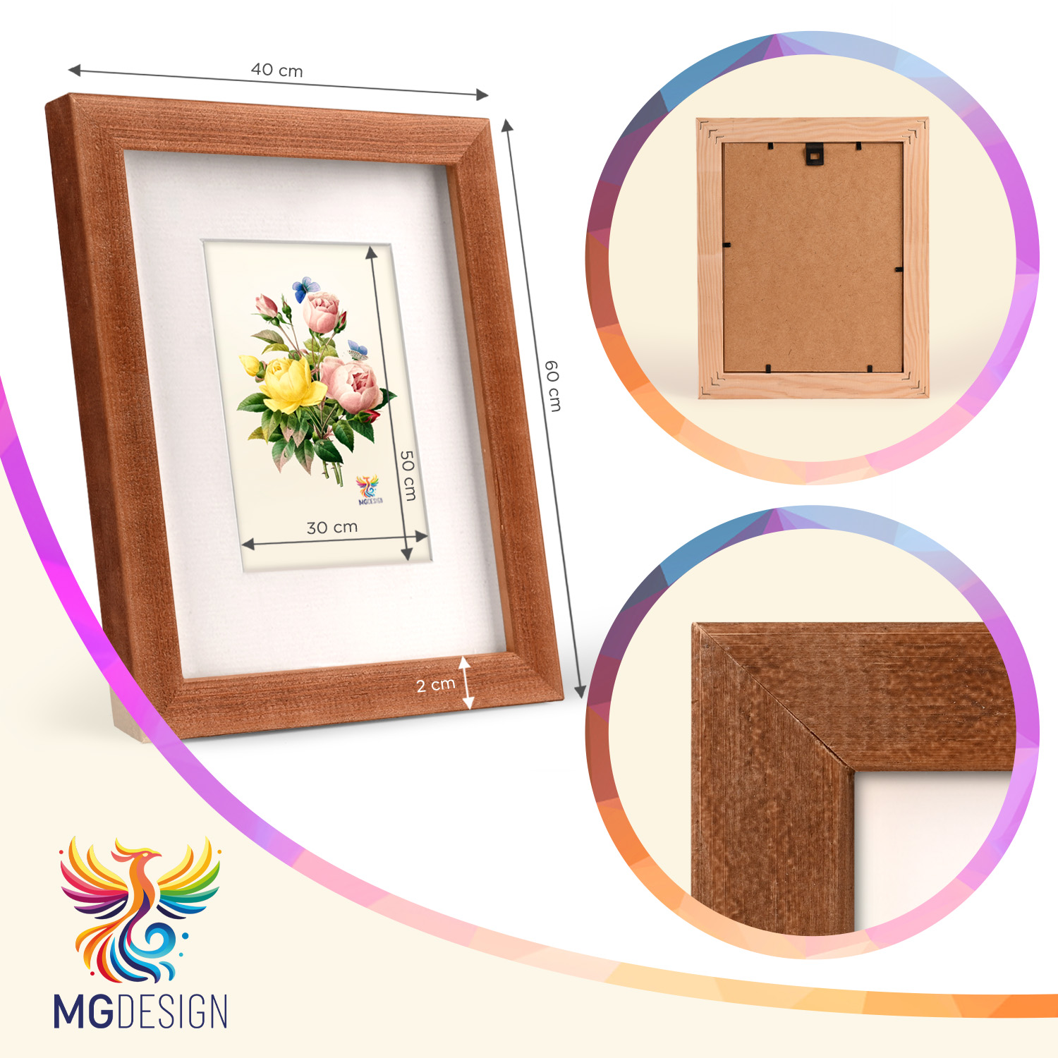 Ramki wykonane są z naturalnego drewna, starannie obrobionego, z zachowaniem widocznej struktury materiału, która nadaje całości naturalny i ponadczasowy charakter. Przód ramek stanowi lekkie i odporne na uszkodzenia plexi, które zapewnia dobrą widoczność oprawianych prac oraz większe bezpieczeństwo w porównaniu do tradycyjnego szkła.