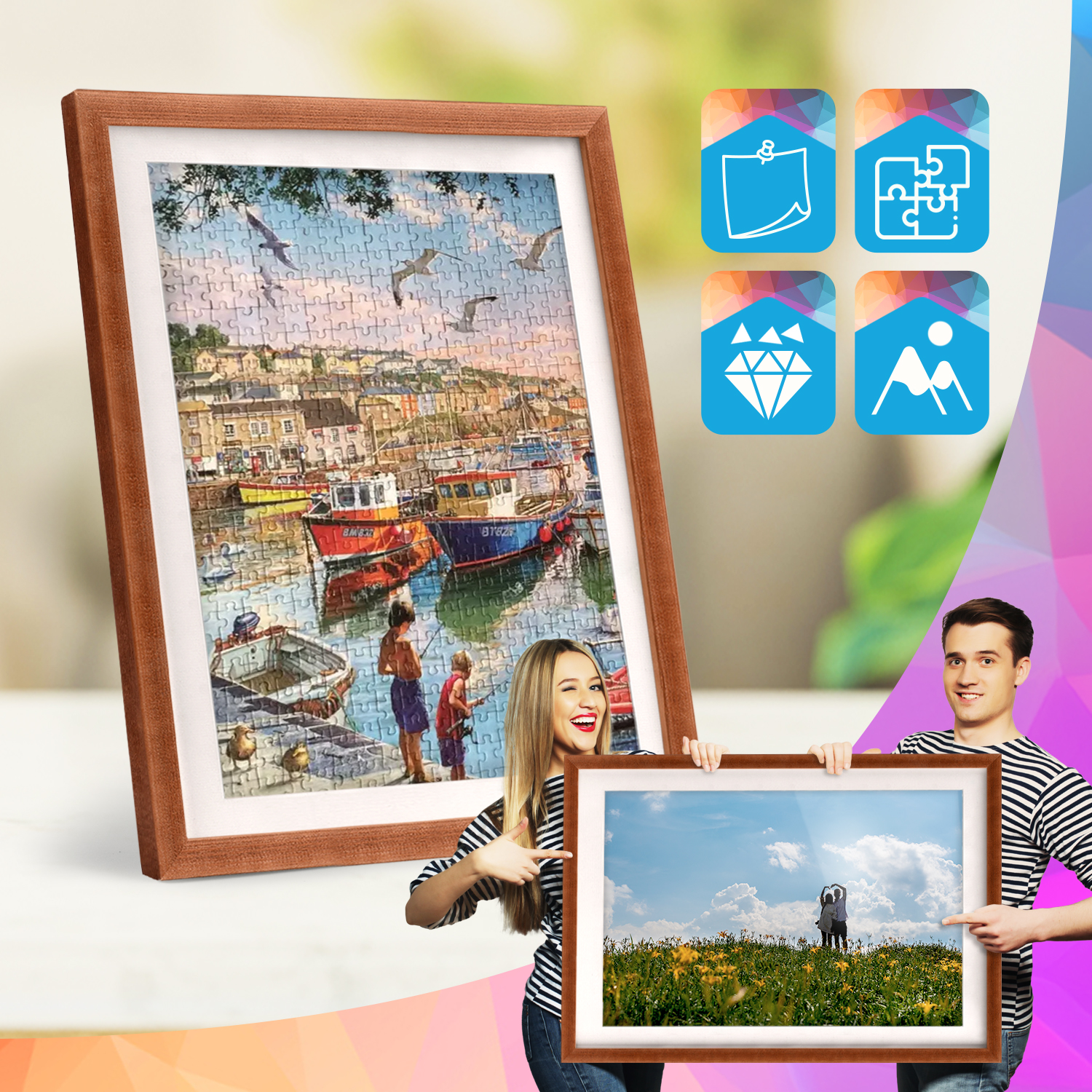 Ramki mogą być ustawione na meblach lub zawieszone na ścianie. Dzięki wysokiemu profilowi uzyskują nowoczesny efekt odsunięcia obrazów od powierzchni, który dobrze prezentuje się zarówno w domowych, jak i komercyjnych wnętrzach.