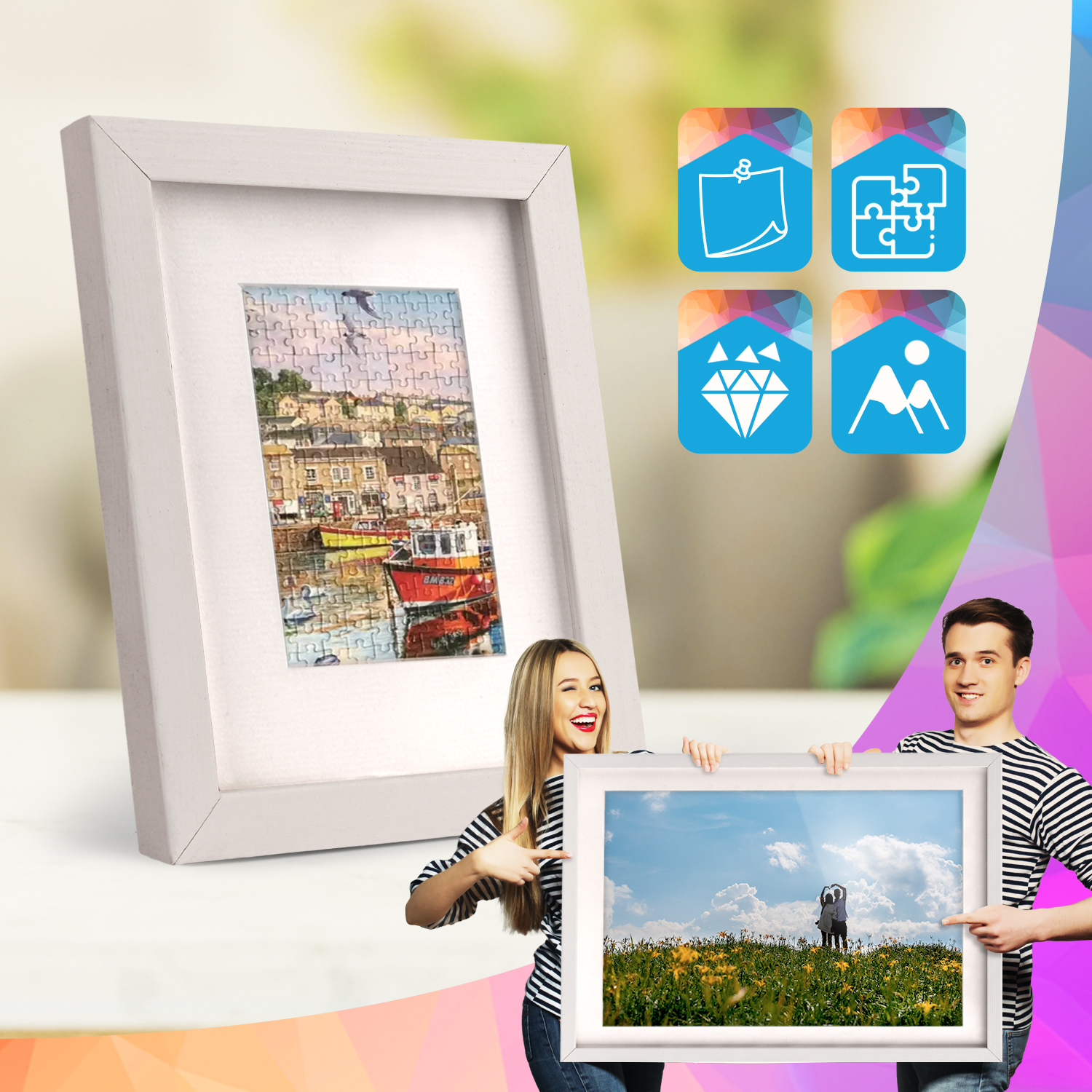 Ramki mogą być ustawione na meblach lub zawieszone na ścianie. Dzięki wysokiemu profilowi uzyskują nowoczesny efekt odsunięcia obrazów od powierzchni, który dobrze prezentuje się zarówno w domowych, jak i komercyjnych wnętrzach.