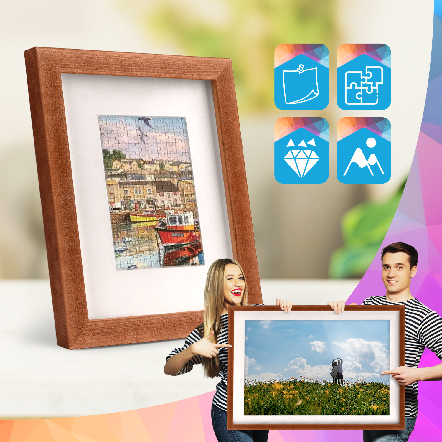 Ramki mogą być ustawione na meblach lub zawieszone na ścianie. Dzięki wysokiemu profilowi uzyskują nowoczesny efekt odsunięcia obrazów od powierzchni, który dobrze prezentuje się zarówno w domowych, jak i komercyjnych wnętrzach.
