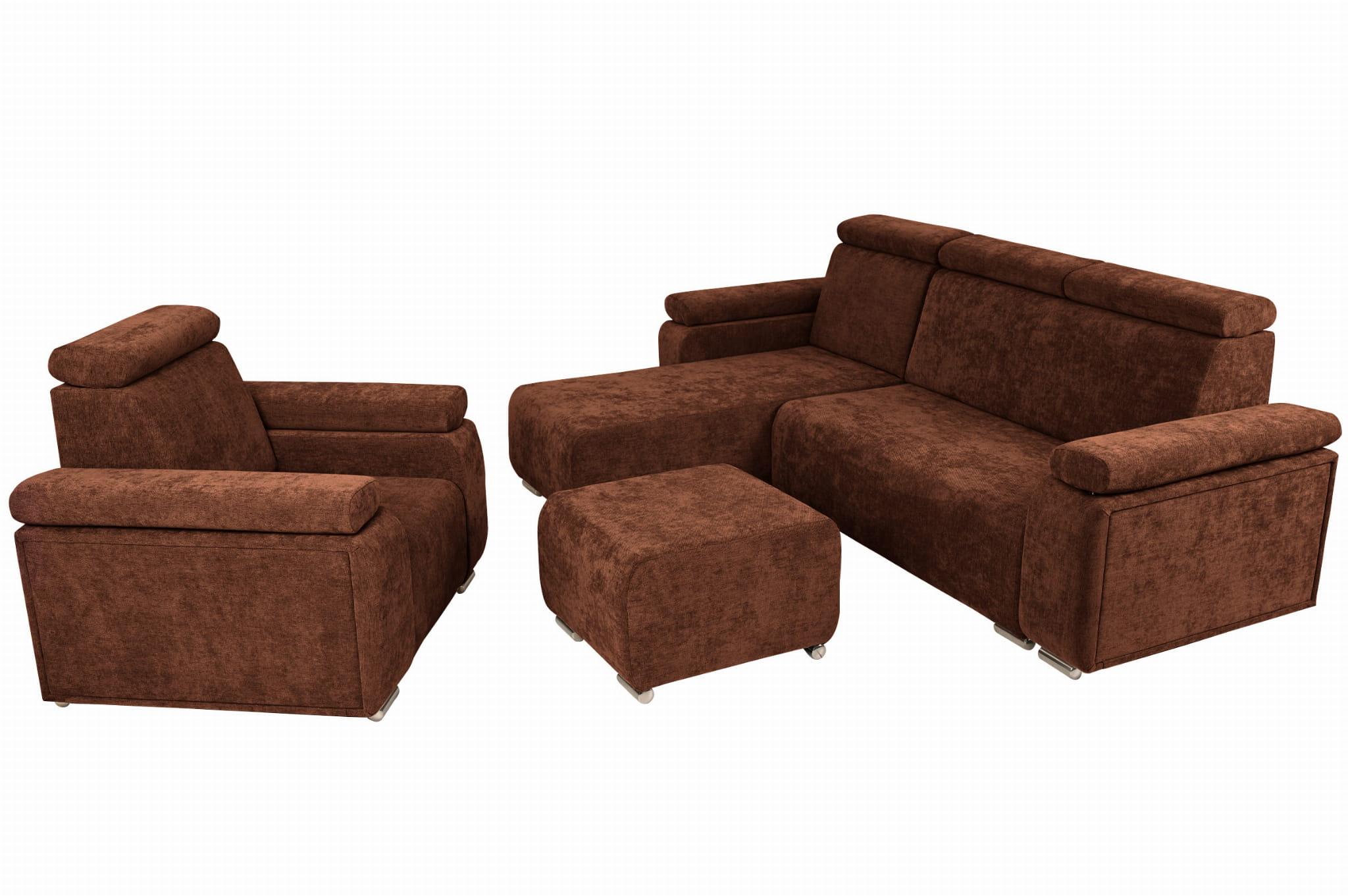 Zestaw mebli z regulowanymi zagłówkami i podłokietnikami MILAN lewostronny w kolorze brązowo-pomarańczowym: fotel, narożnik, pufa