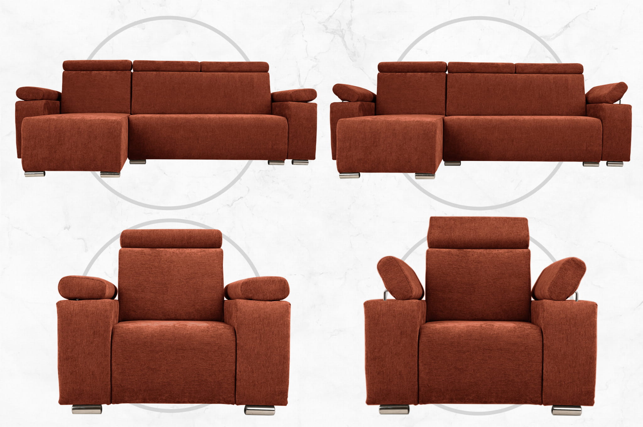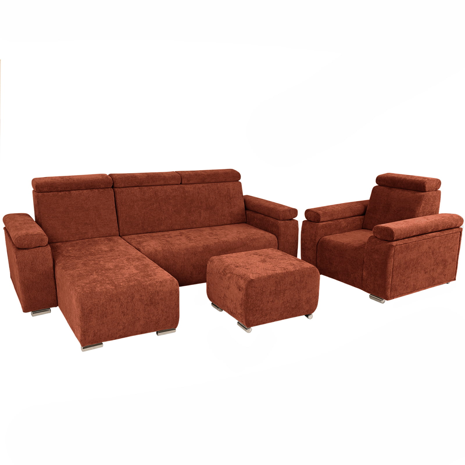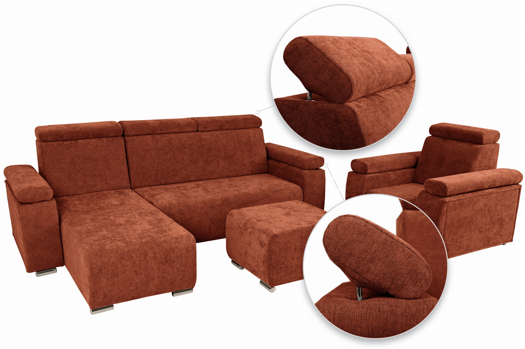 Zestaw mebli z regulowanymi zagłówkami i podłokietnikami MILAN lewostronny w kolorze ceglastym: fotel, narożnik, pufa