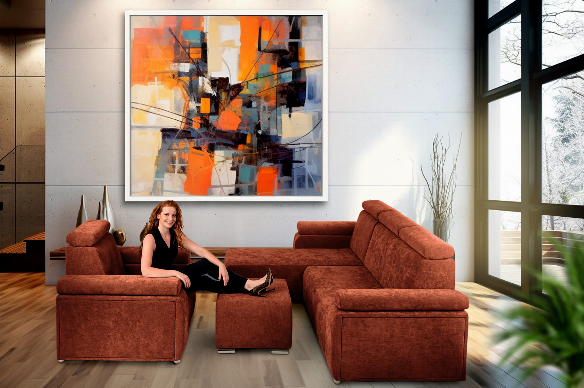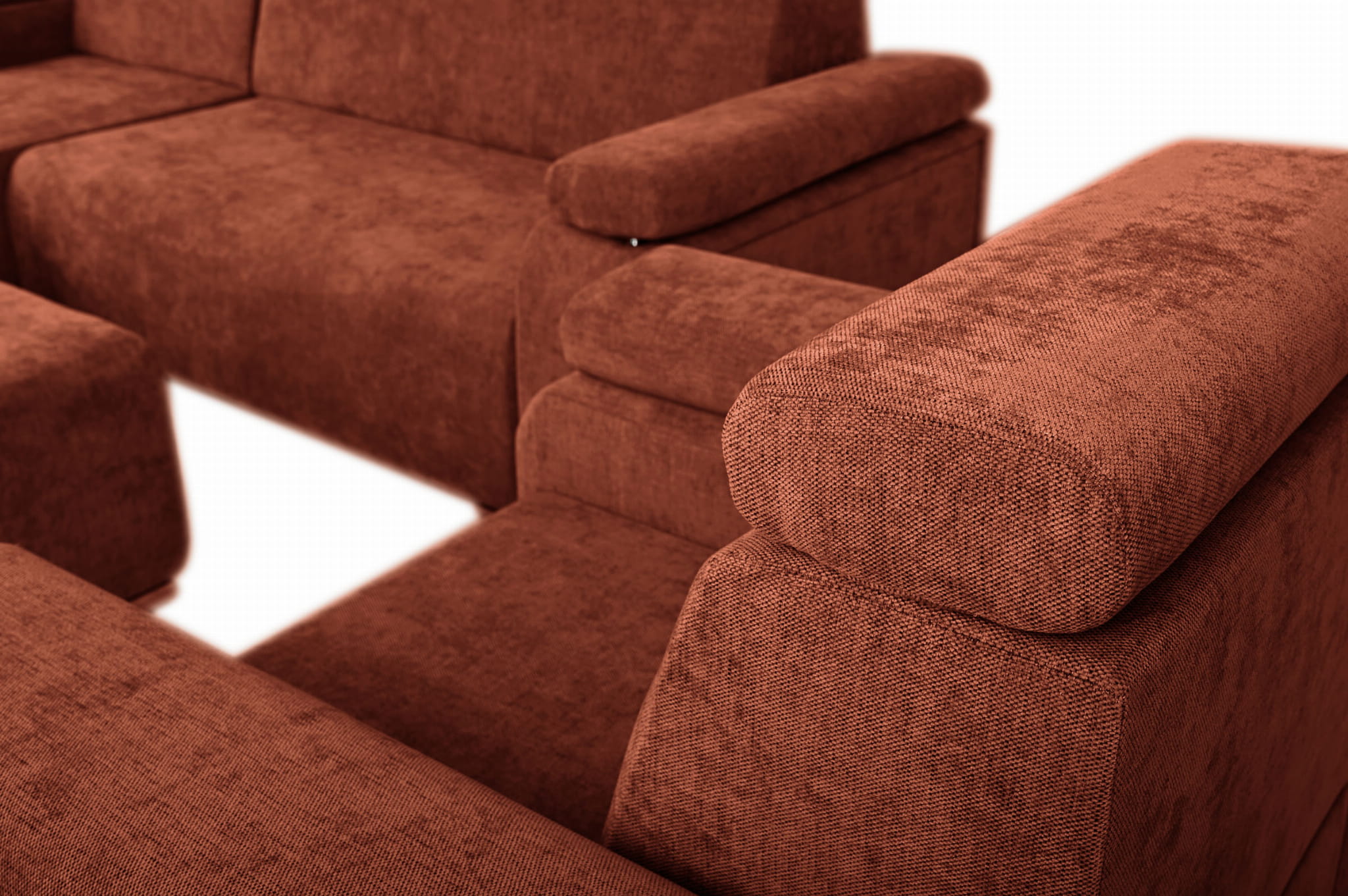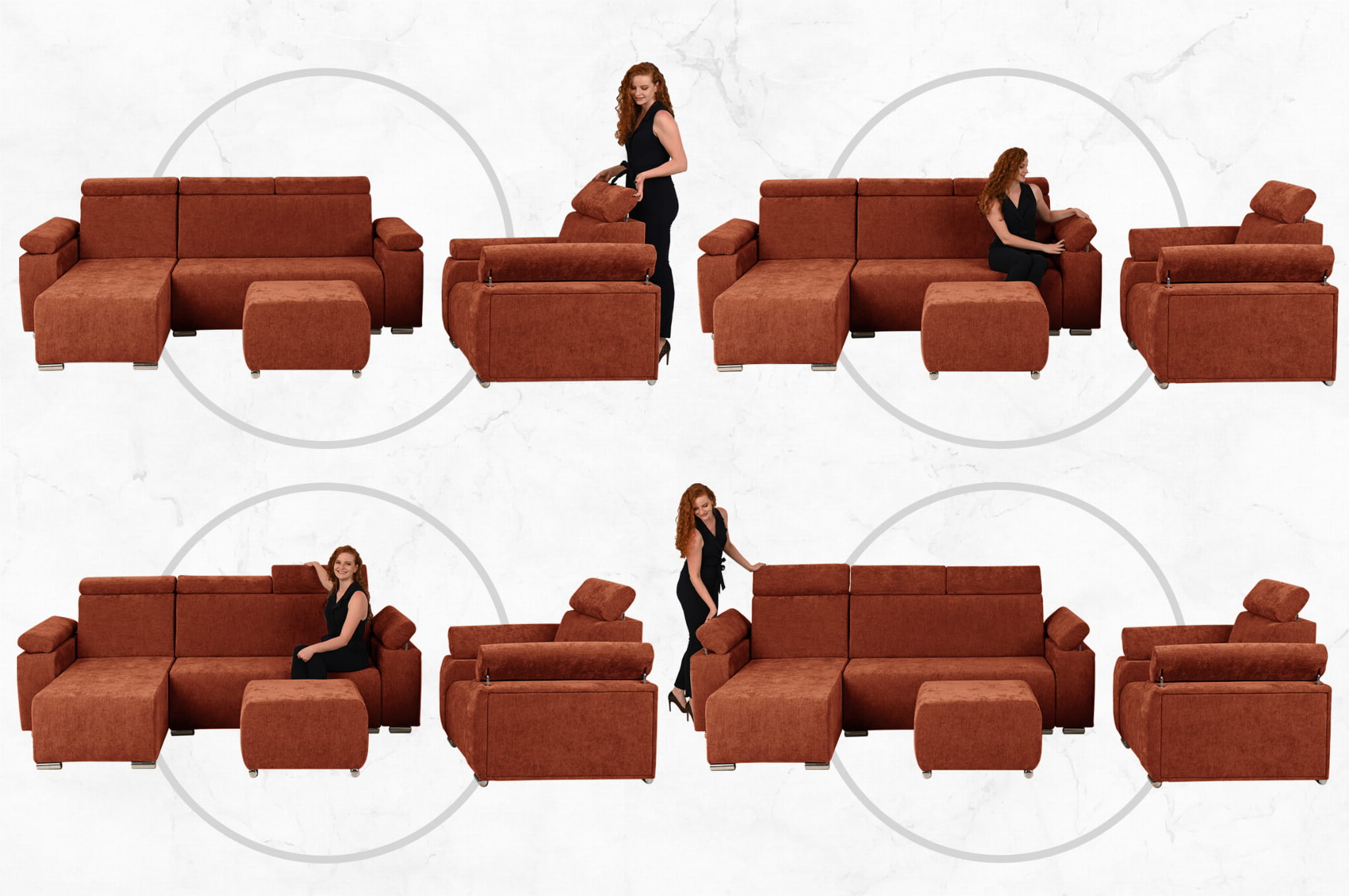 Zestaw mebli z regulowanymi zagłówkami i podłokietnikami MILAN lewostronny w kolorze ceglastym: fotel, narożnik, pufa