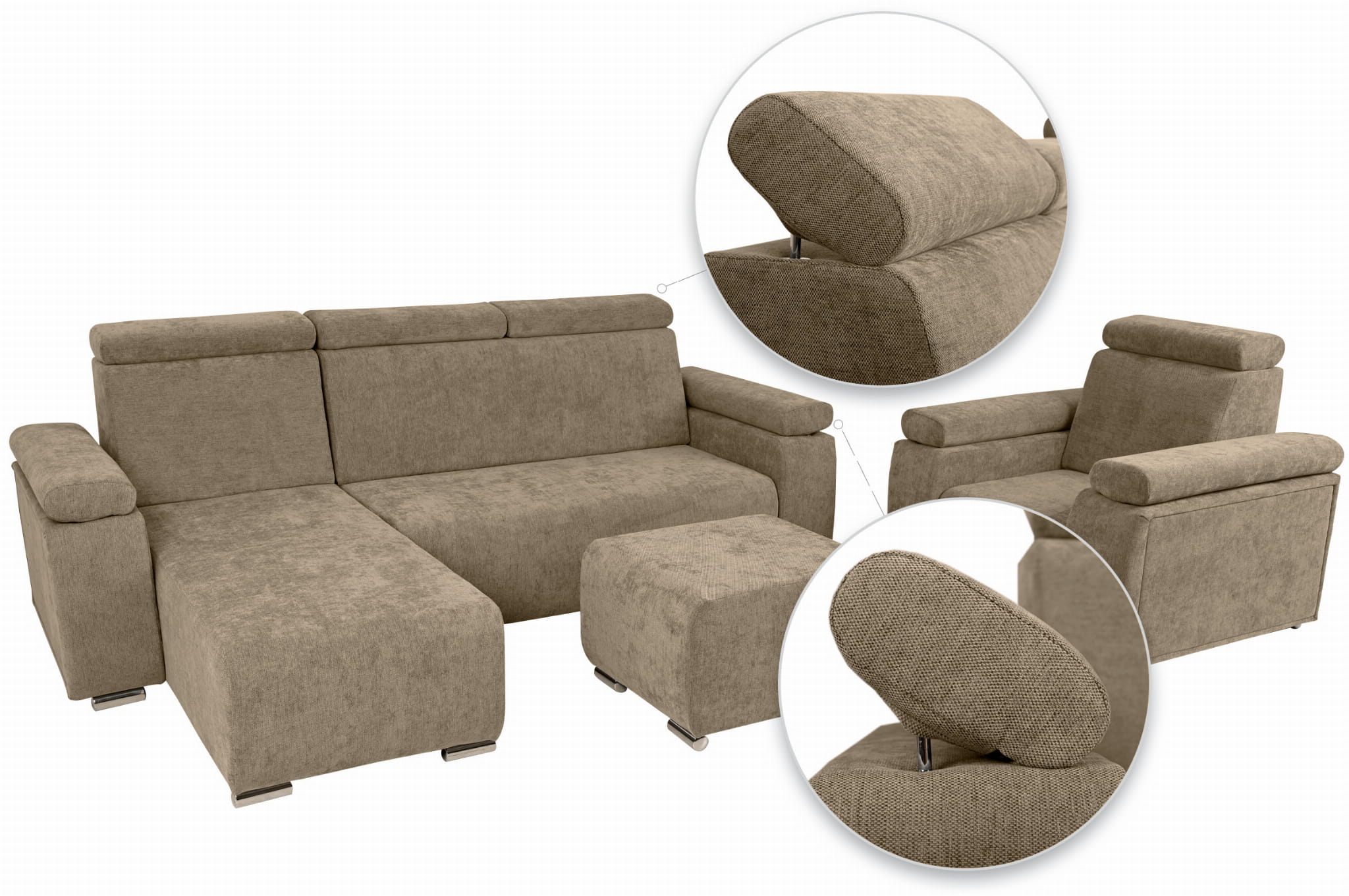 Zestaw mebli z regulowanymi zagłówkami i podłokietnikami MILAN lewostronny w kolorze jasnobrązowym: fotel, narożnik, pufa