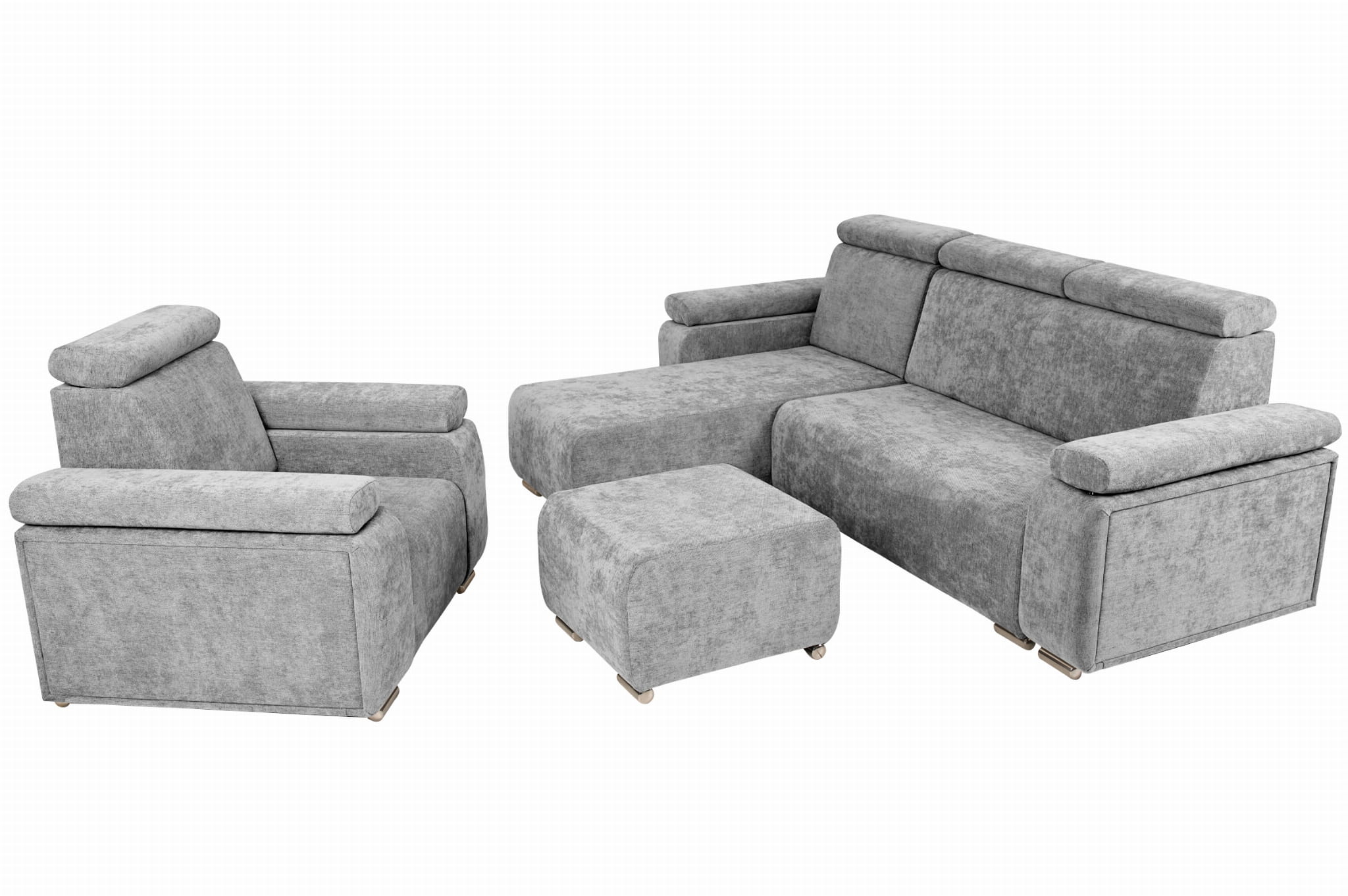 Zestaw mebli z regulowanymi zagłówkami i podłokietnikami MILAN lewostronny w kolorze szarym: fotel, narożnik, pufa