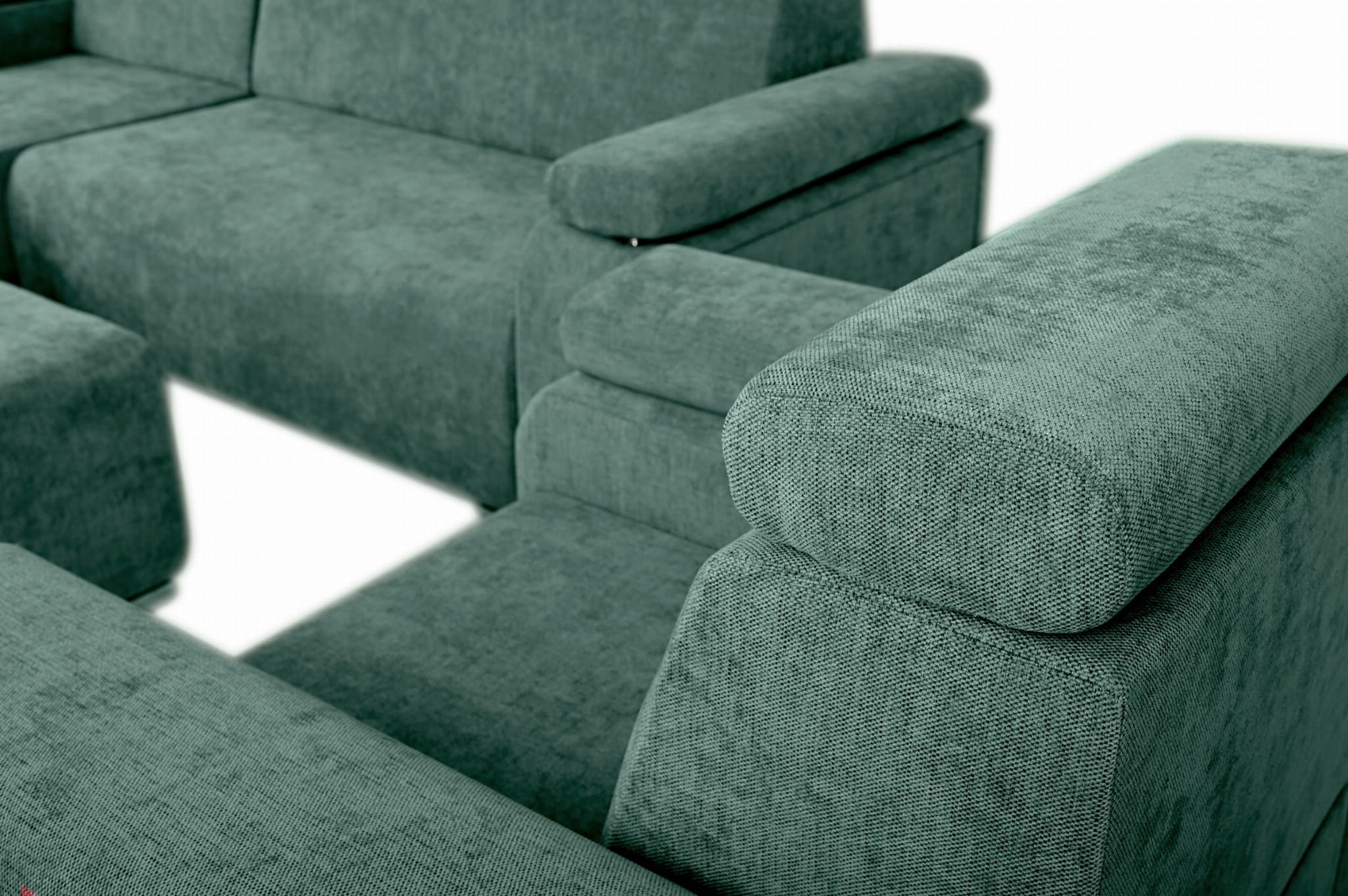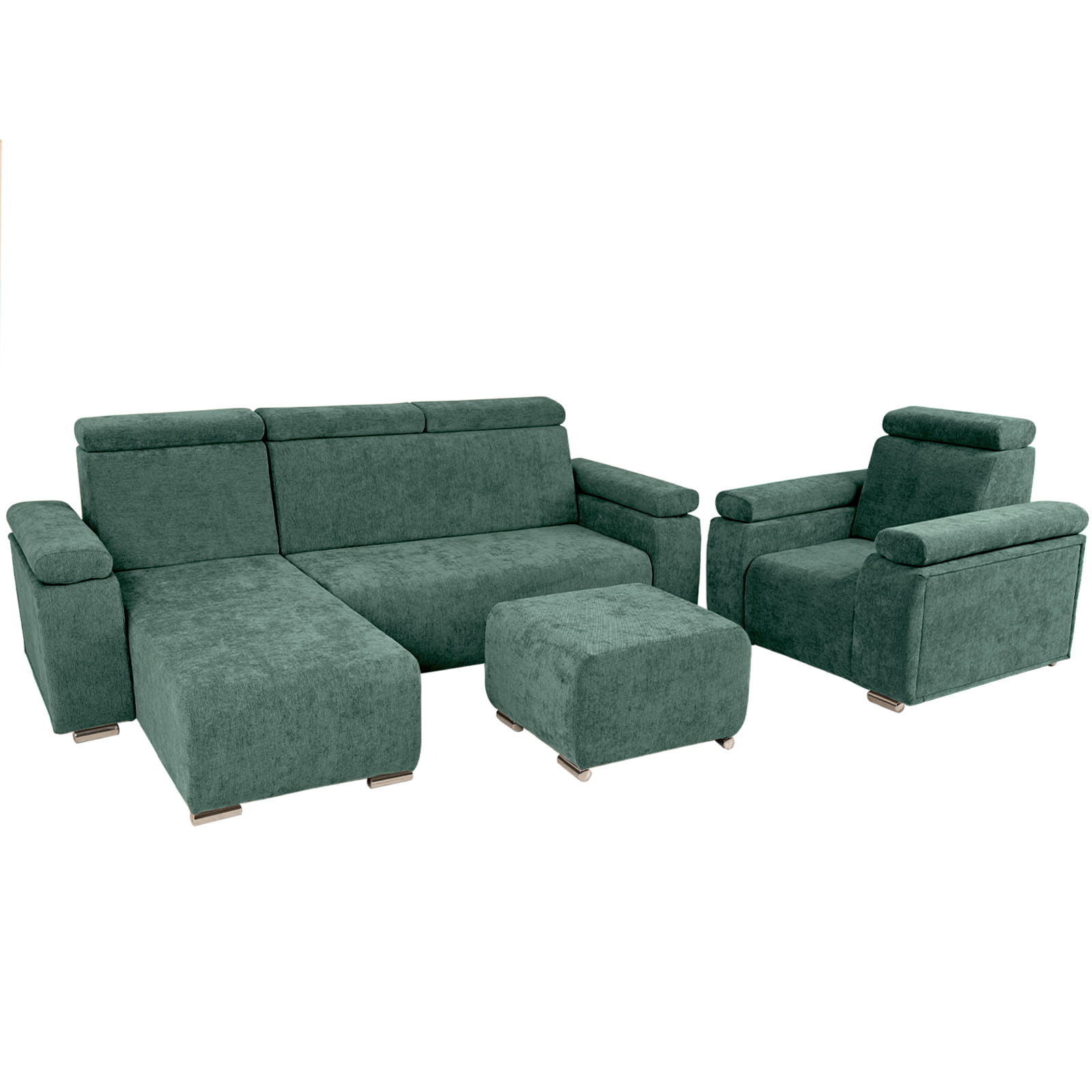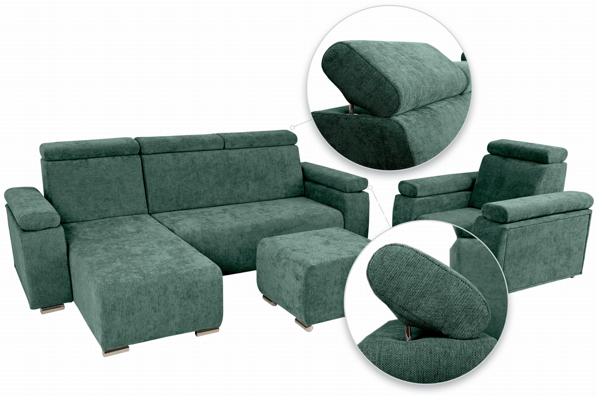 Zestaw mebli z regulowanymi zagłówkami i podłokietnikami MILAN lewostronny w kolorze zielonym: fotel, narożnik, pufa