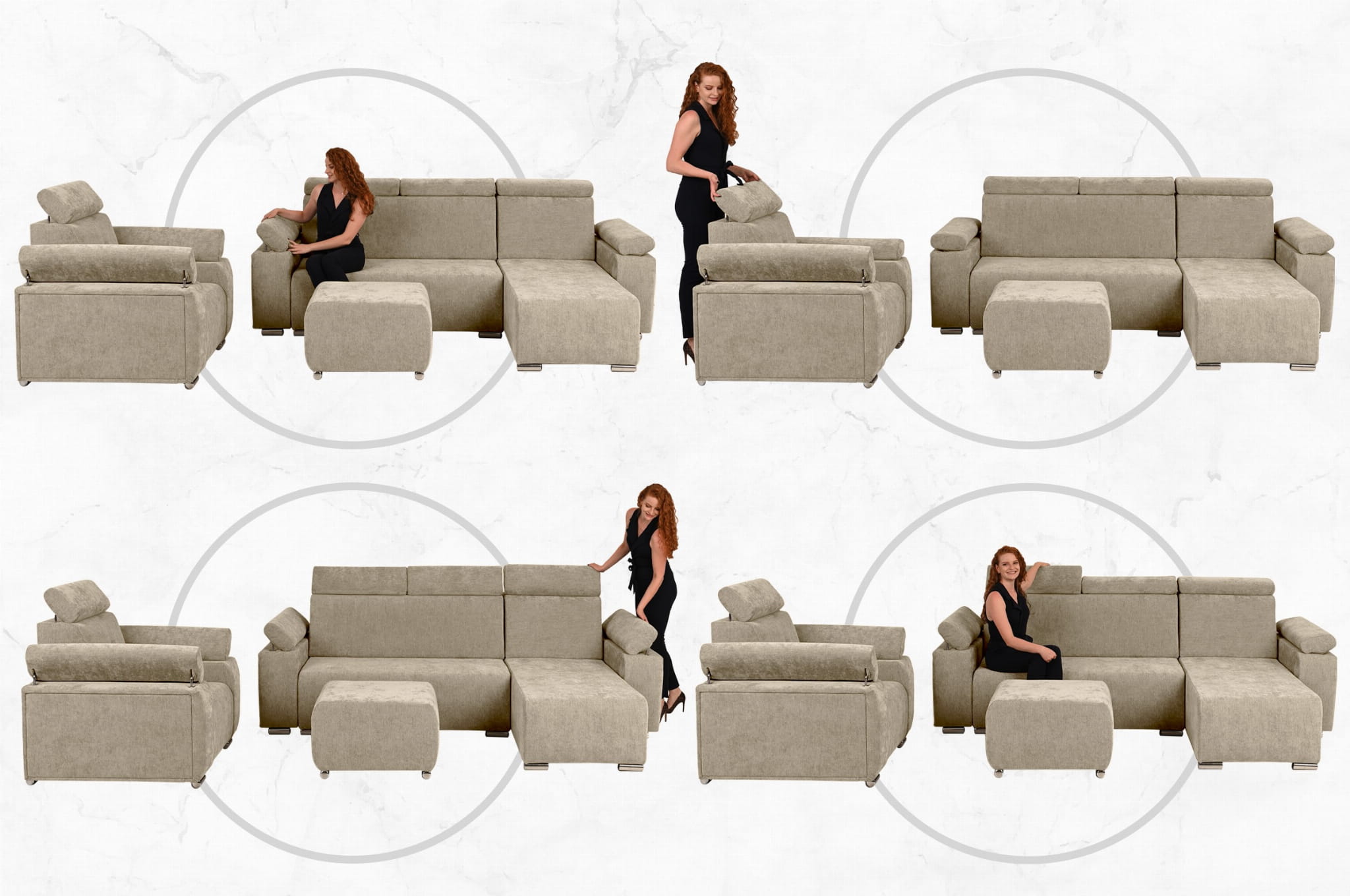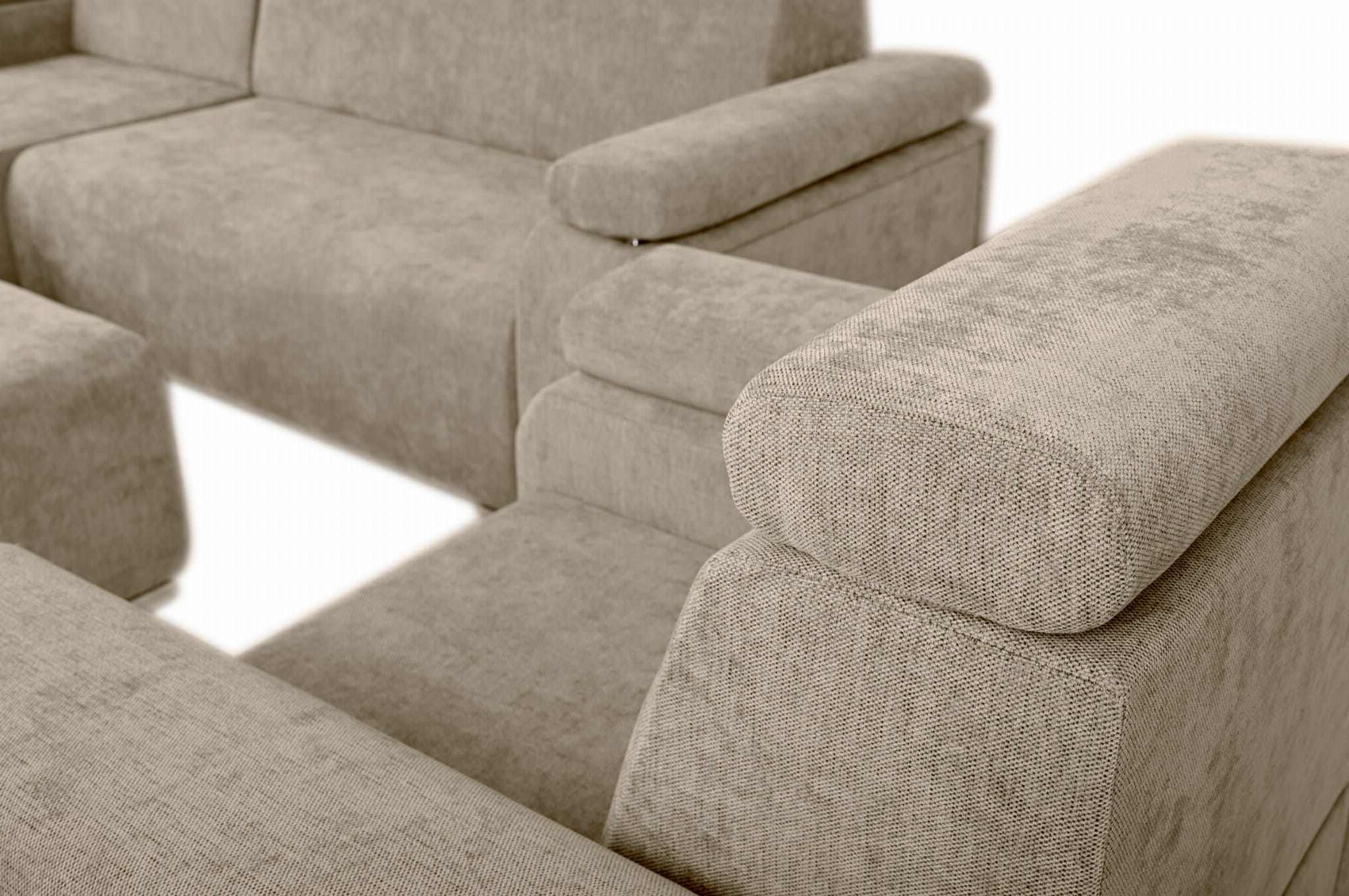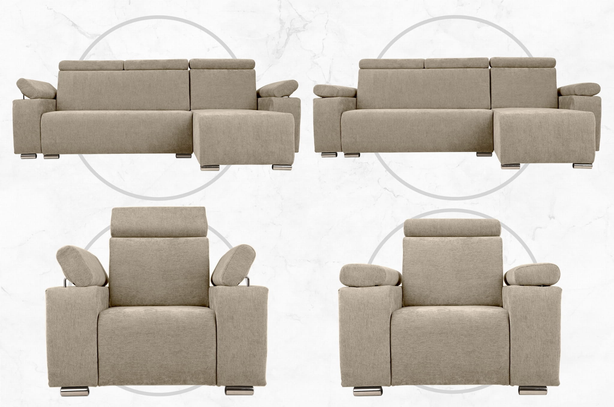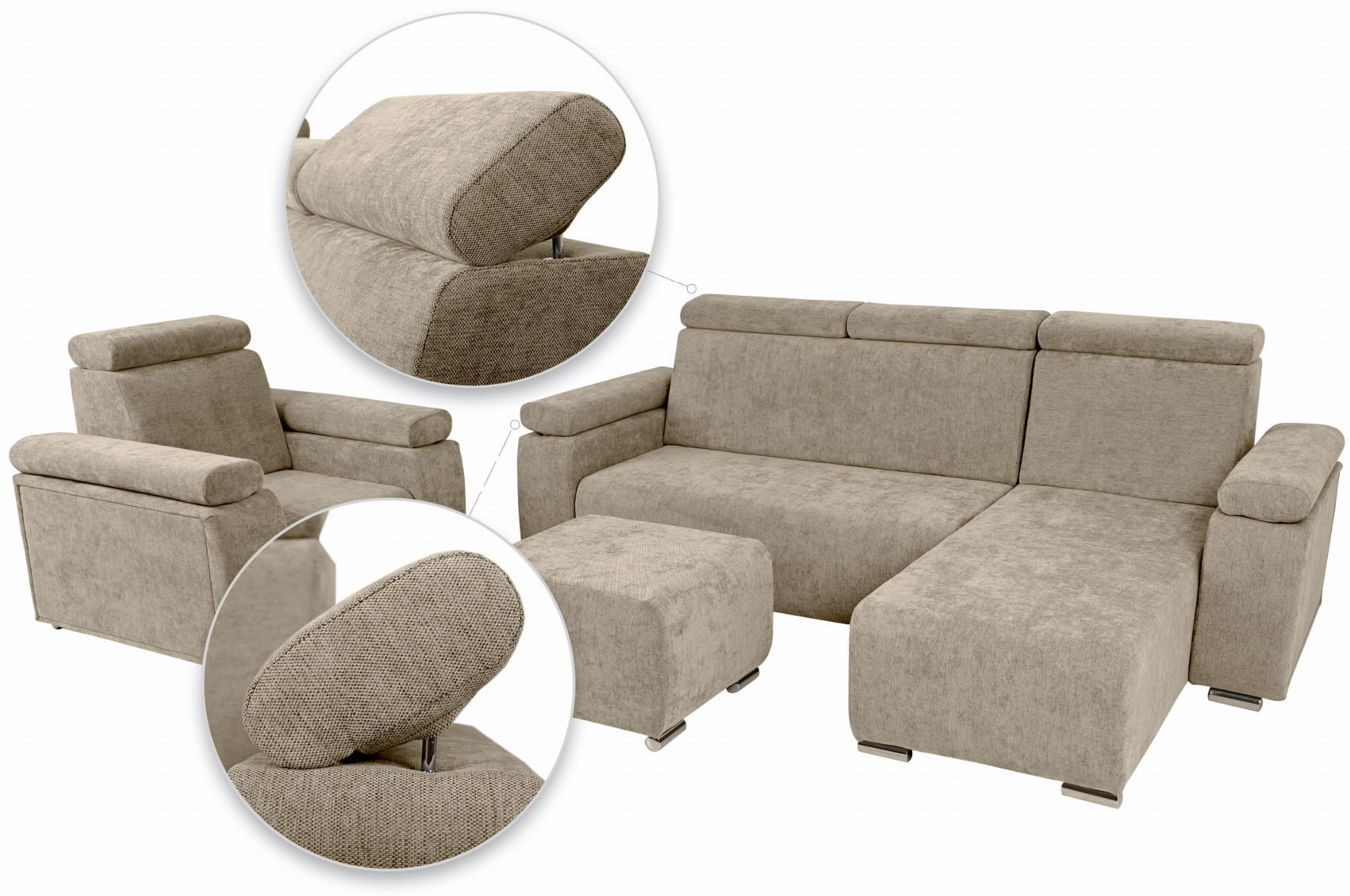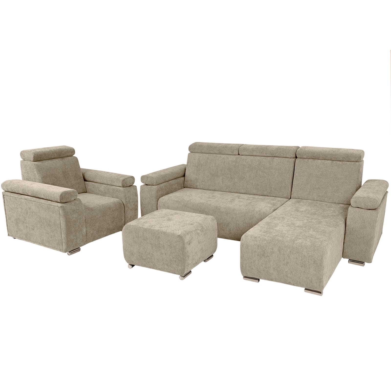 Zestaw mebli z regulowanymi zagłówkami i podłokietnikami MILAN prawostronny w kolorze beżowym: fotel, narożnik, pufa