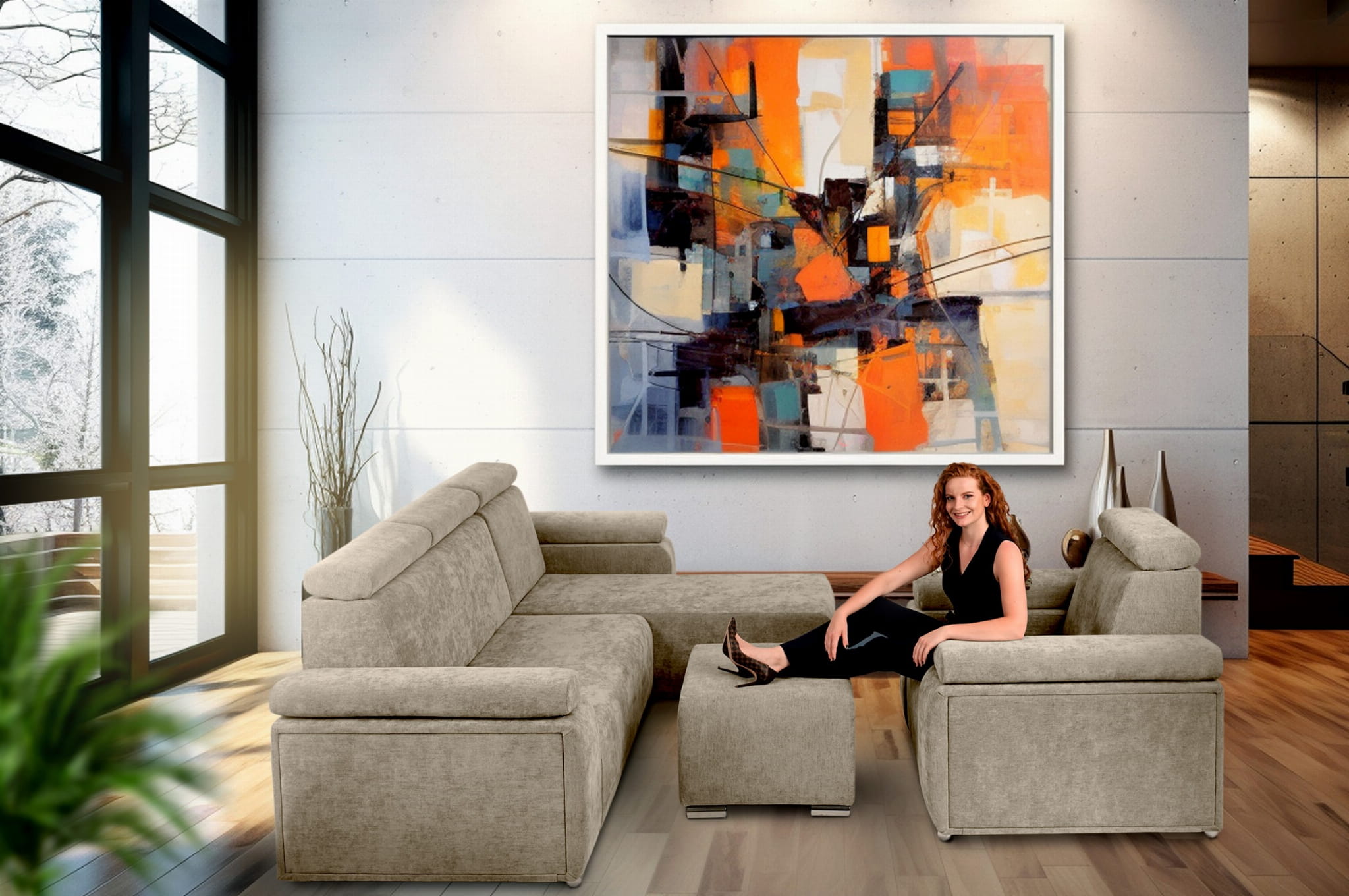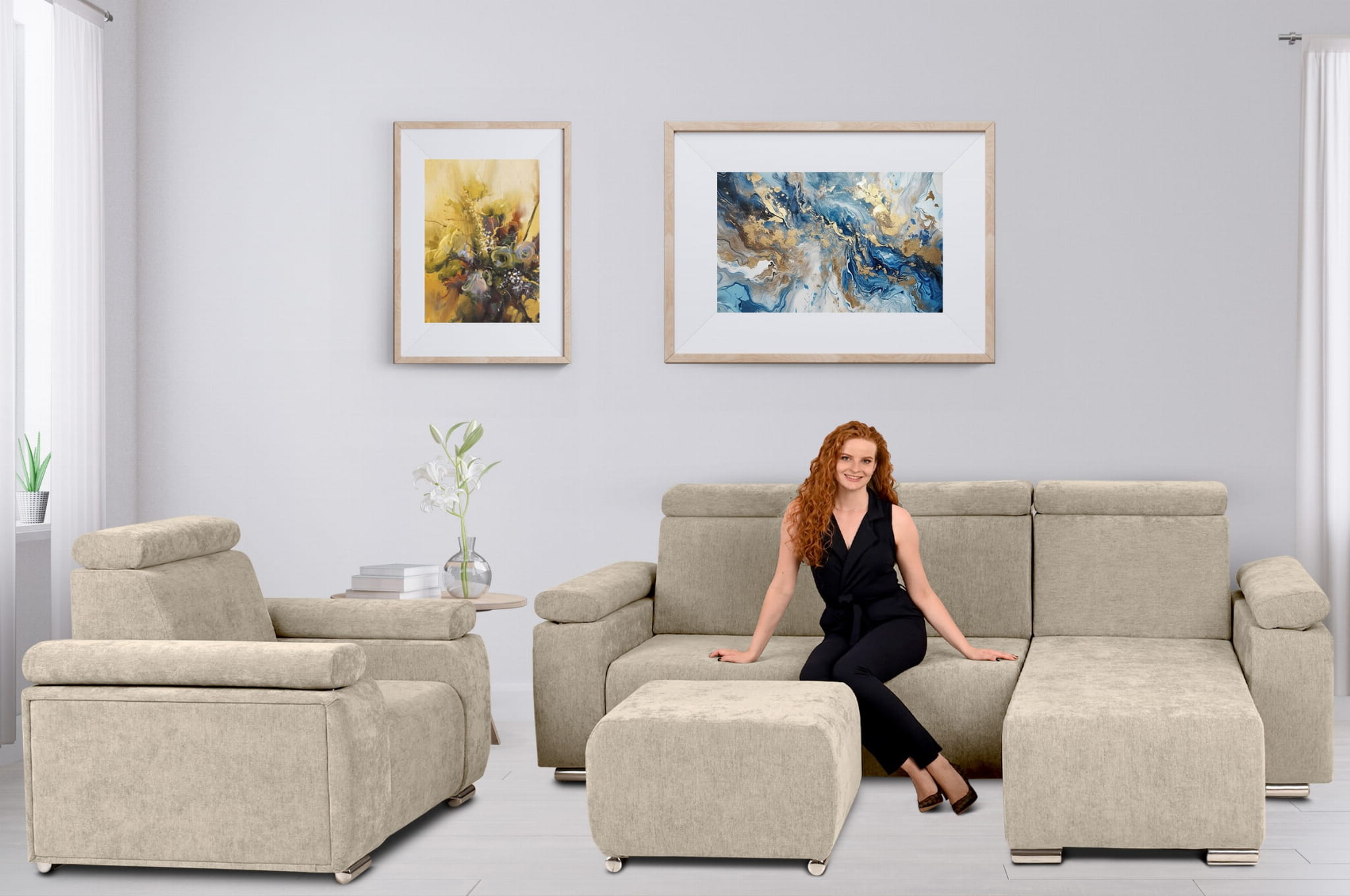 Komfort i Styl: Zestaw Mebli z Regulowanymi Zagłówkami i Podłokietnikami – Fotel, Narożnik i Pufa
