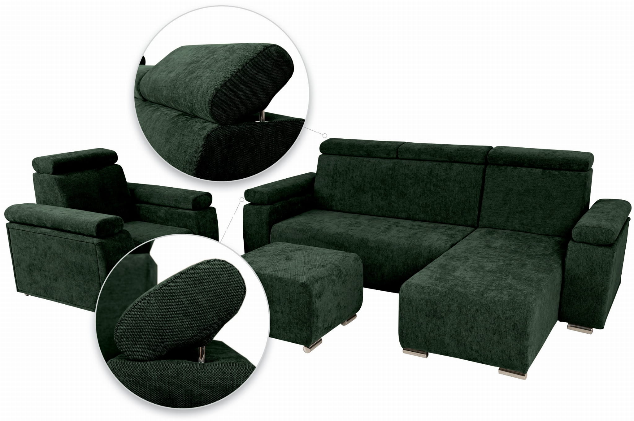 Zestaw mebli z regulowanymi zagłówkami i podłokietnikami MILAN prawostronny w kolorze ciemnozielonym: fotel, narożnik, pufa
