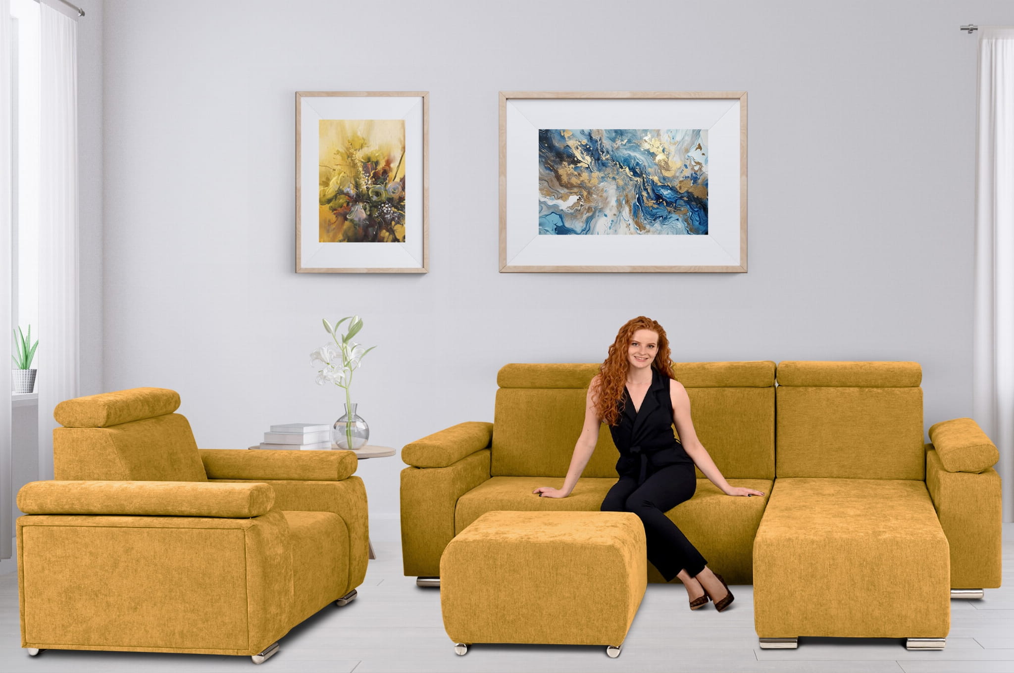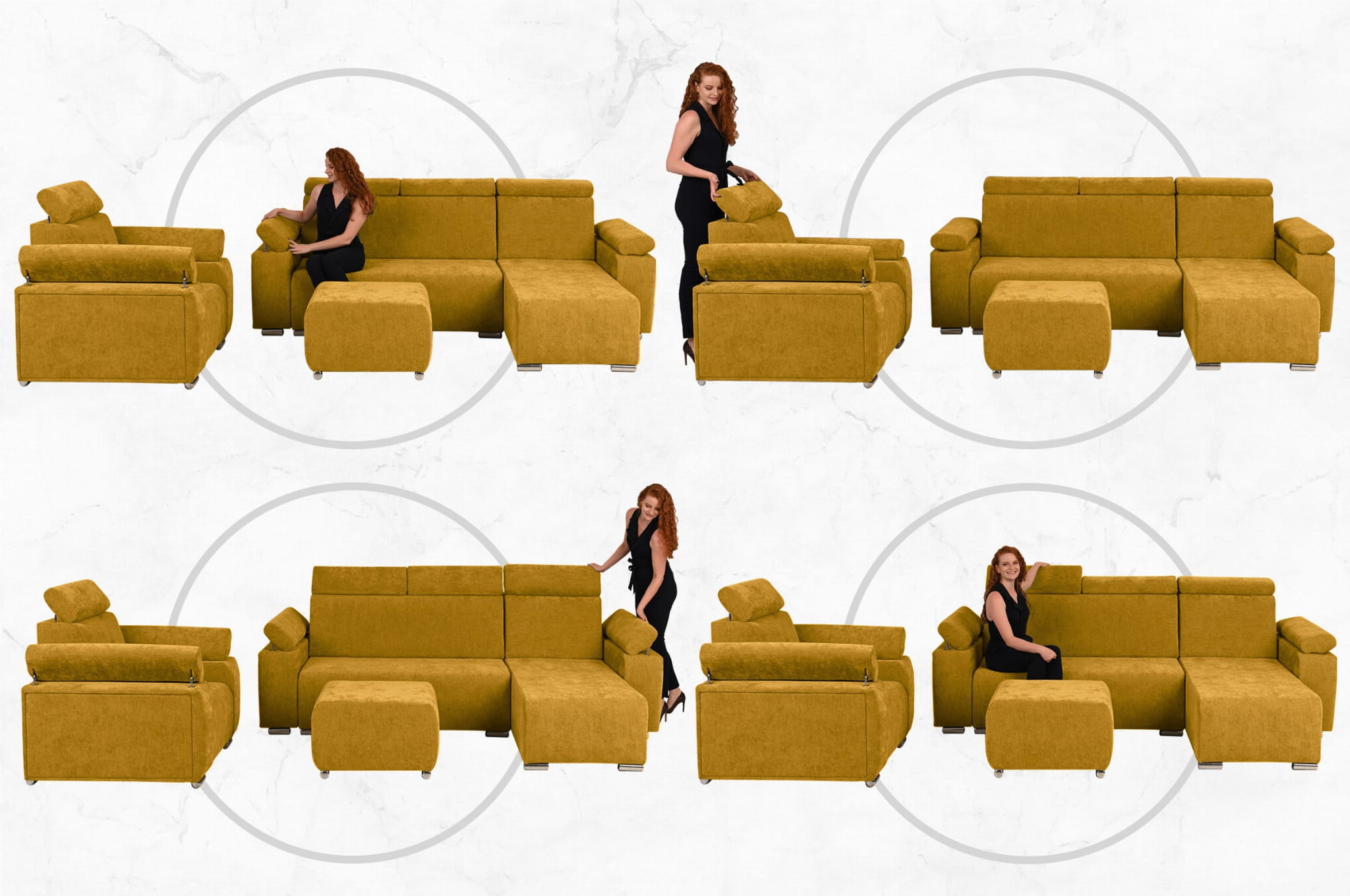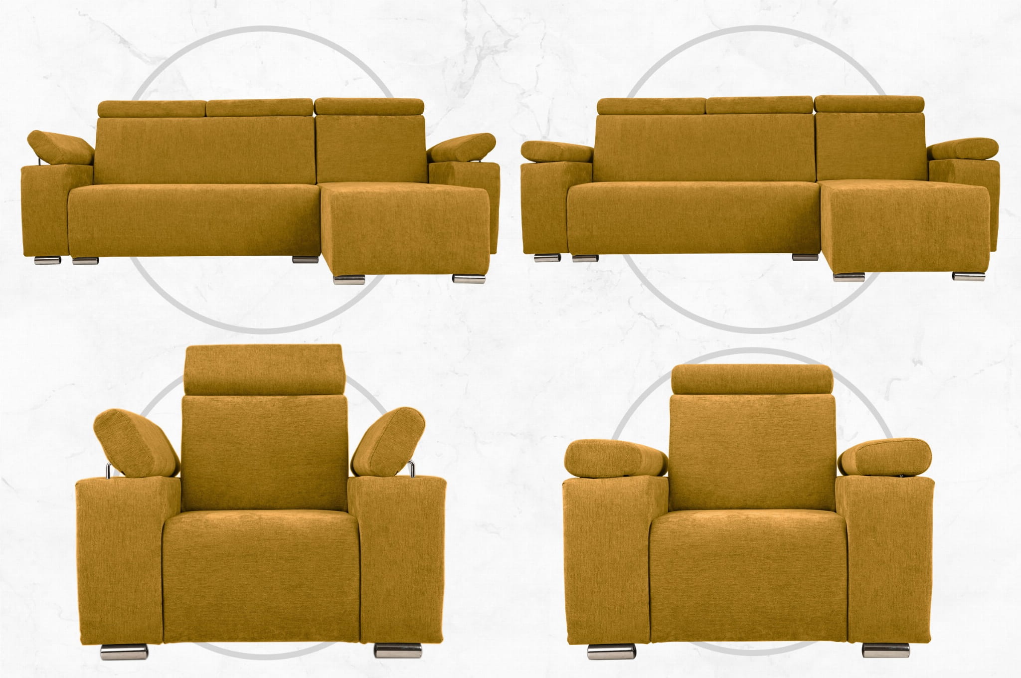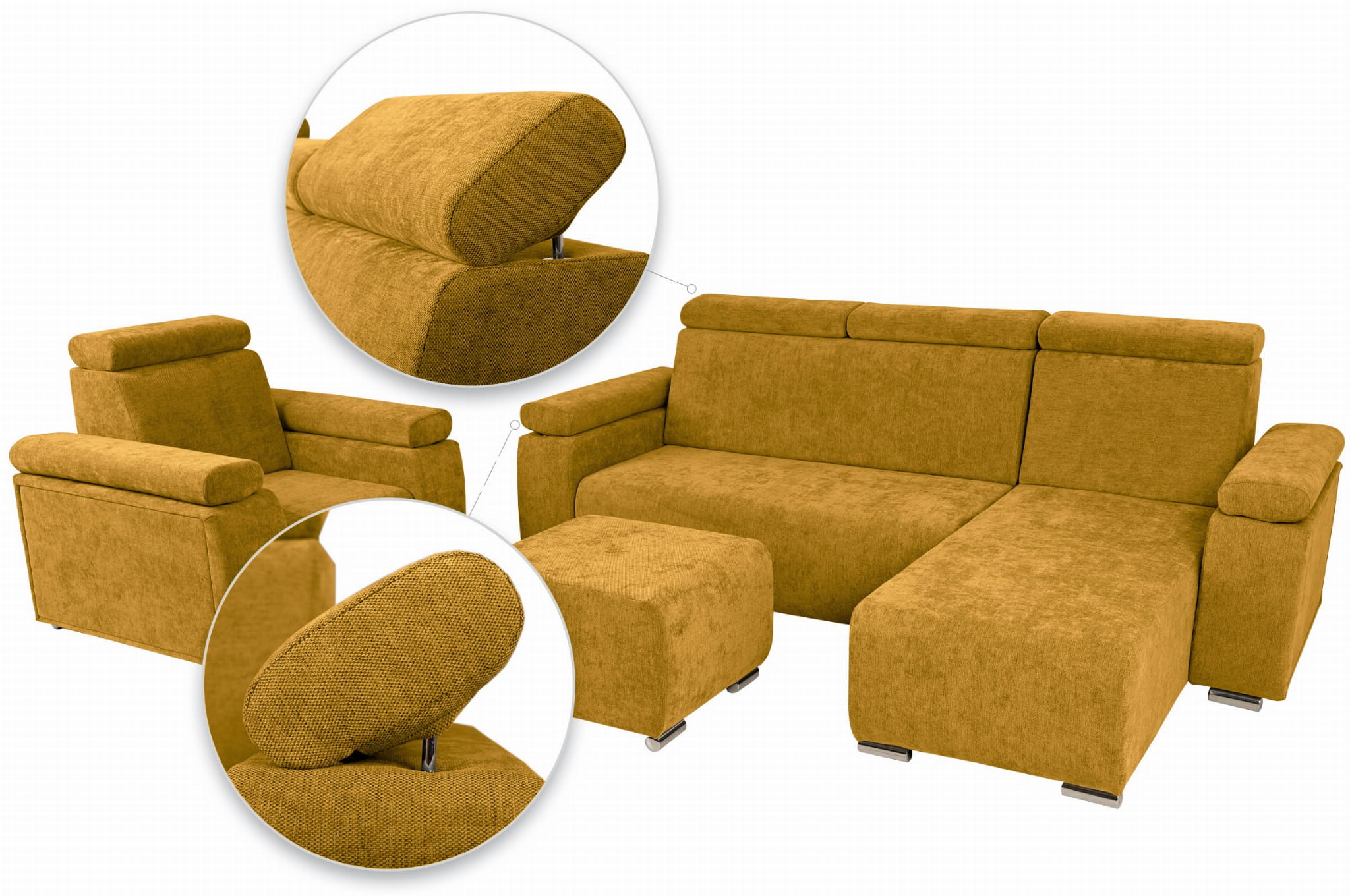 Komfort i Styl: Zestaw Mebli z Regulowanymi Zagłówkami i Podłokietnikami – Fotel, Narożnik i Pufa