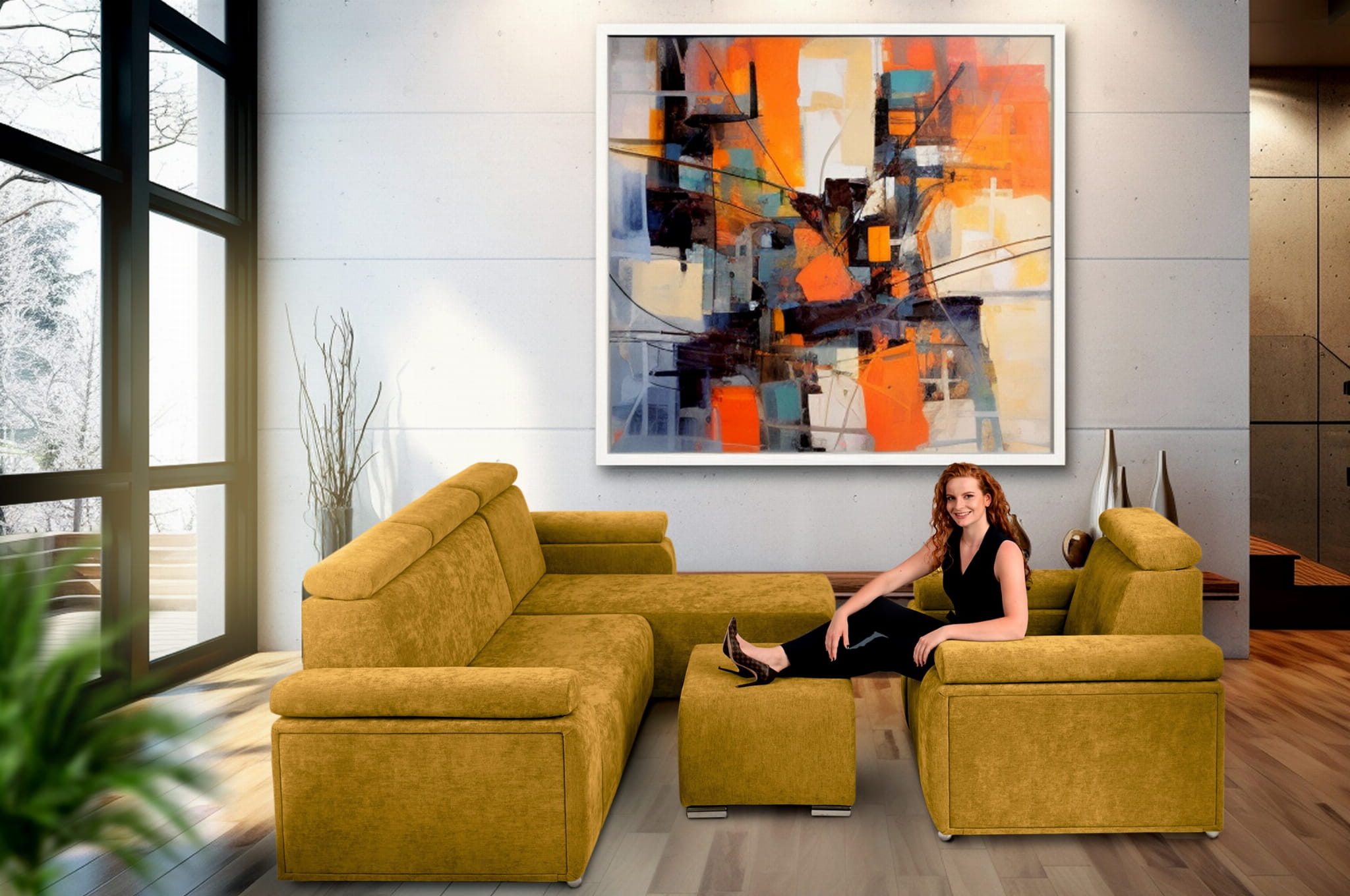 Zestaw mebli z regulowanymi zagłówkami i podłokietnikami MILAN prawostronny w kolorze pomarańczowym: fotel, narożnik, pufa