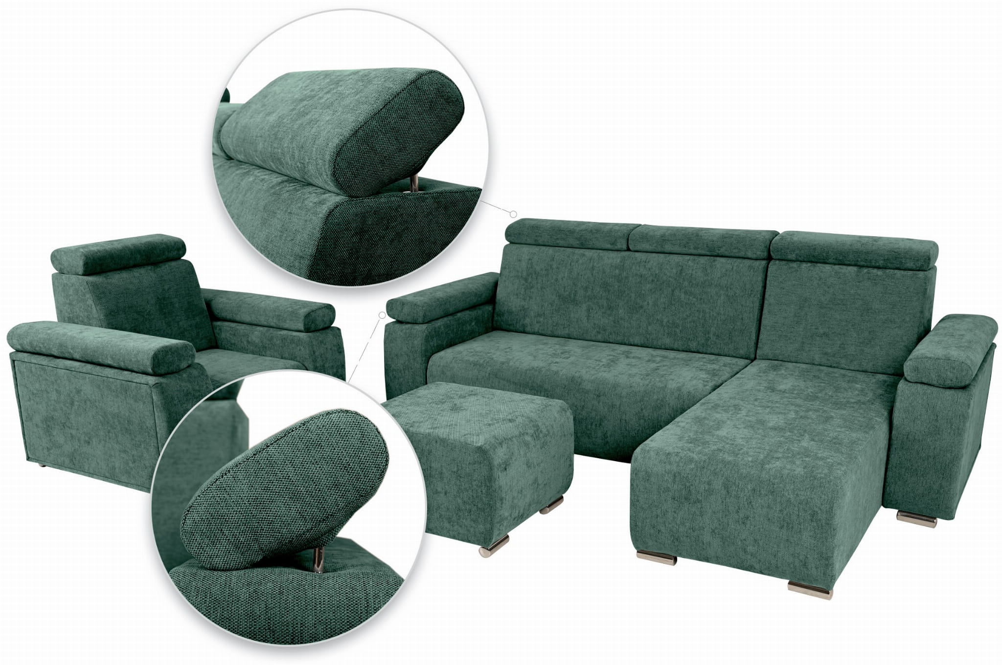 Zestaw mebli z regulowanymi zagłówkami i podłokietnikami MILAN prawostronny w kolorze zielonym: fotel, narożnik, pufa